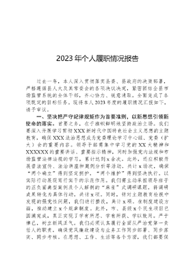 2023年个人履职情况报告过去一年,本人深入贯彻落实县委、县政府的决策部署,严格遵循县人大及其常委会的各项决议决定,紧密团结全县市场监管系统的全体干部,齐心协力、锐意进取,全面完成了各项既定的目标任务。现将本人2023年度的履职情况汇报如下,请予审议。一、坚决把严守纪律规矩作为首要准则,以新思想引领新使命的落实。首要之务,在于旗帜鲜明地坚持政治立场。我们要深入开展学习贯彻XXX新时代中国特色社会主义思想的主题教育,确保XXX法治思想成为党委理论学习中心组、党委(扩大)会的重要内容。领导干部需集中学习党的XX大精神和XXXXXX的重要讲话、重要指示精神,同时加强党内法规和市场监管法律法规的学习,累计达到x余次。此外,还应积极开展普法宣传、法治讲座和案例分析等活动,共计x场次,确保两个确立得到坚定拥护,两个维护得到坚决执行。以实际行动展现笃行实干的示范作用。我们需主动承担领导班子的正负面典型案例及个人解剖的麻雀式调研课题,将调研成果转化为具体行动,共计x项。同时,针对主题教育检视中发现的强党性问题,我们进行整改,共计x项。在制度建设方面,推动建立x个规章制度。此外,市、县级x个民生项目已圆满完成,真正实现了学有所思、学有所获、学以致用。严于律己,树立新风正气。我们必须认真履行全面从严治党第一责任人的职责,确保党风廉政建设与业务工作同步部署、同步落实、同步考核。在思想、工作、生活等各个方面,我们都要保持廉洁自律,自觉接受组织和群众的监督。同时,我们要坚持民主集中制原则,坚决服从组织的决策和决定。通过过硬的作风,我们要正行风、树新风,确保权力为民所用、情感为民所系、利益为民所谋。二、坚定地将推动高质量发展作为首要任务,以崭新的作为开启新的篇章。首先,经营主体的质量和数量均有所增长。市场主体净增x万户,总数量达到x万户,在全市中排名x位,在渝东北地区位列第x,领先于全市其他x个县,第二产业提升了x个百分点,经营主体结构得到了进一步的优化。其次,发展引擎的强大驱动力。消费品质量合格率连续两年达到x%,农产品安全监测合格率持续保持在x%以上,食品评价性抽检合格率稳定在x%以上。国家级龙缸景区旅游服务标准化试点项目有序推进,市级三峡云菊栽培标准化示范项目通过验收,x面工地方标准获批立项。x红橙获得重庆市商标品牌奖励。知识产权创造运用保护成效显著,质押融资增长x倍,发明专利增速位居全市首位。最后,安全底线得到了坚实的维护。坚持源头严格控制、过程严格管理、风险严格查处、闭环落实,成功地守住了不发生特种设备安全事故、重大产品和服务质量事件的底线,食品药品连续x年实现零事故,经济报表、平安报表、民生报表市场监管指标稳定保持A档。食品安全工作在全国食品产业高质量发展大会、总局营商环境座谈会、全市食药安委全体(扩大)会上作交流发言,获评全国食品安全社会共治十佳案例。三、坚决将依法行政作为最高准则,以新的担当彰显新的突破。首先,自觉接受人大监督。高质量办理县人大常委会评议县人民政府老旧小区改造工作反馈意见,积极探索共有产权电梯委托管理新模式,全县x余台共有产权电梯全部实现委托管理;完成县人大法治政府建设评议反馈意见及法治督查反馈问题整改销号;承办x件人大代表建议意见获得满意评价。其次,加大重点整治力度。与全国x个知识产权部门共文可居文库——海量学习资料,手机电脑均可下载www.wenkeju.com同签署《县域知识产权跨区域协作协议》,签订万达开云区域市场监管行政执法战略合作协议,聚焦价格收费、广告、网络交易、民生计量、消费投诉等人民群众高度关注的重点领域,持续发力加大铁拳整治,全年立案查处x件,移送公安x件。最后,严格依法依规行政。全面执行行政执法三项制度,审定出台《县市场监管局行政处罚案件评查工作办法(试行)》,开展行政处罚案卷集中评查x件,通报问题x个2023年市局对县局案件评查得分x分,较2022年同比提升x分,x件案卷被县司法局评为优秀案卷,办理行政复议案件x件。实现执法案件零纠错、行政复议零撤销、行政诉讼零败诉、行政赔偿零赔偿目标。回顾过去一年的工作,虽然自己勤勉尽责,取得了一些成绩,但对照县人大常委会的要求和群众的期盼还有一定差距。在未来的工作中,我将进一步加强对学习的重视,深入思考实干、务实争先,在推动x强县富民现代化示范县建设中做出积极贡献。文可居文库——海量学习资料,手机电脑均可下载www.wenkeju.com