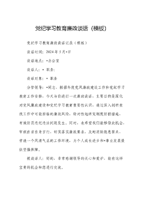 党纪学习教育廉政谈话(模板)党纪学习教育廉政谈话记录(模板)谈话时间:2024年5月*日谈话地点:*办公室谈话人:* 职务:谈话对象:* 职务分管领导:*同志,根据年度党风廉政建设工作和党纪学习教育工作安排,今天与你进行一次廉政谈话,主要目的是深化对党风廉政建设和党纪学习教育重要性认识,通过深入剖析查找工作中可能面临的廉政风险,针对性地研究制度防控措施,有效防范违纪违法问题发生。同时,也希望我们能够借此机会,审视自省自身言行,切实落实廉政要求,及时消除隐患苗头,营造一个风清气正的工作环境,为个人成长进步和*事业发展提供坚强保障。被谈话人:好的,非常感谢领导的关心和爱护,能有这样宝贵的机会和您进行交流。分管领导:请您谈谈对廉洁意识的理解?你认为廉洁对于工作的重要性在哪里?被谈话人:分管领导:请你分析下你在工作中面临哪些廉政的风险点?你是如何防范这些廉政风险的?被谈话人:分管领导:你对从事工作的相关法律法规和规章制度掌握吗?如何确保遵守这些规定?被谈话人:分管领导:您对目前单位党风廉政建设工作的整体情况有什么看法(整体评价+优缺点)?有哪些好的建议和意见?被谈话人:分管领导:本次廉政谈话取得了预期效果。你对廉政建设的重要性有深刻的认识,对自身岗位风险有着清醒认识,并制定了针对性的防范措施,工作中也能严格遵守各项规章制度,并把廉洁自律作为行为准则,贯彻于工作和生活的方方面面。文可居文库——海量学习资料,手机电脑均可下载www.wenkeju.com同时,也感谢你对单位党风廉政建设提出的一些有建设性的建议和意见。最后,也希望你能以此次党纪学习教育为契机,加强党纪学习,不断加强廉政教育,提升廉洁意识和道德修养,持续推动工作再上新台阶。被谈话人:文可居文库——海量学习资料,手机电脑均可下载www.wenkeju.com