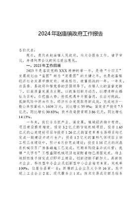 2024年赵庙镇政府工作报告各位代表:现在,我代表赵庙镇人民政府,向大会报告工作,请予审议,并请列席会议的同志提出意见。一、2023年工作回顾2023年是落实党的XXX精神的第一年,是将十四五发展规划由蓝图转为实景图的关键之年,也是赵庙镇经济社会发展举旗定向、破冰前行、极富挑战的一年。一年来,在县委、县政府和镇党委的坚强领导下,在镇人大的监督支持下,以高质量发展为主题,以改革创新为动力,以增进群众福祉为目标,在把握大势、抢抓机遇中开拓奋进,在应对挑战、抵御风险中担当作为。经济社会发展取得新成效,完成地方一般公共预算收入1609万元,同比增长35.9%;固定资产投资7.5亿元,同比增长30.83%;技术改造投资额3.86亿元,同比增长14.13%。一年来,我们全力抓产业、谋发展,镇域经济稳中有进。项目建设提质增效。投资3.2亿元的宁锐机械项目、投资1.65亿元的山美建材项目与投资1.26亿元的富贵草养生茶项目均已完成一期建设并进行生产;投资1.2亿元的富邦气体项目主体工程正在建设中,预计6月份完成建设;投资1.16亿元的润昌泉机械项目厂房基础施工已完成,近期采购设备并试运营;我镇天字号工程盛阳机械项目地面附着物已清理完成,待土地招拍挂手续完成后即开工建设。创新动能不断加大。高新技术企业、科技型中小企业及创新型中小企业培育8家,完成率100%,位居全县第一名;新增四上企业及大个体16家,其中规上工业企业2家、现代服务业1家;技术交易成交额总任务4600万元,完成率100%;企业研发投入任务1108万元,完成1500万,超额完成15%;投资16000万元的年产10000吨矿用梯子间及井筒装备生产项目正在实施中,投资9600万的年产6000吨气流纺棉纺线升级改造项目、投资8600万的年产18000吨精密机械配件设备升级项目、投资7600万的再生资源回收再利用升级改造项目均已完成,企业发展动能得到提档升级。项目招引蹄疾步稳。围绕高端装备零部件制造产业,实施精准招商战略,发挥大产业引领、大项目支撑的招商引领作用,外出招商25余人次,洽谈项目17个,签约亿元以上项目3个,新开工亿元以上项目1个,10亿元以上项目1个;省商务平台上报到位资金6400余万元,利用外资30万美元,获得第一季度县招商引资工作流动红旗。一年来,我们着力夯基础,促脱贫,乡村振兴扎实推进。基础设施日趋完善。投资800余万元的赵庙自来水厂,已完成建设,正式运营后可实现全镇集中供水;投资100余万元新建佀楼村污水处理站1处,满足赵楼村、佀楼村日常污水处理需求;结合稻田退水项目,投资50余万元提升改造佀楼河西段南岸,改善河域环境;投资150余万元,建设赵庙镇振兴路,打造新外环,有效缓解商业街南段交通压力;投资30余万元对县乡公路赵庙至王庄段2400余平方米坑洼路面进行挖补,改善出行条件。乡村振兴有效衔接。持续巩固拓展脱贫攻坚成果同乡村振兴有效衔接工作。脱贫户人均纯收入达1.3万元,同比增长9.95%。投资194.6万元的赵庙镇村级基础设施项目完成建设。健全防返贫监测机制。加强动态监测和返贫预警,紧盯已脱贫户家庭收入支出、两不愁三保障等方面的困难,对普通农户开展常态化监测预警,高度关注脱贫不稳定户、边缘易致贫户和突发严重困难户,精准落实帮扶措施,持续抓好兜底保障等工作,牢牢守住不发生规模性返贫底线。三农发展更加稳固。始终把粮食安全放在突出位置,坚决遏制耕地非农化,防止耕地非粮化,整改耕地流出图斑面积文可居文库——海量学习资料,手机电脑均可下载www.wenkeju.com406.44亩,违法用地图斑面积21.6亩,全力守牢耕地红线;全力推进5400亩高标准农田建设,提高农业综合生产能力,确保旱能浇、涝能排;实施农村实用人才培育计划,组织种养大户、家庭农场、农民合作社等农业生产经营服务主体参加农业生产经营从业者培训、高素质农民培训等各类培训活动10余次,累计培训300余人次,增强农民现代种养技术,增加农民收入;赵庙镇豪瑞家庭农场注册微风荷润农产品商标,创建湖西稻花香大米品牌,形成产销一体的发展新模式,助力乡村振兴。一年来,我们倾力聚民心、办实事,民生事业持续改善。民生底线全力兜牢。全面落实城乡低保、困难补助等社会保障。发放低保金近130万元,临时救助36户68人,发放临时救助金6.8万元;加强残疾人帮扶措施,为14名残疾人发放辅助器具,为1名五保老人申请办理白内障复明手术,帮助1名重度视力残疾人报名参加山东省中途失明人士光明之家生活重建训练营,为4名低保重度残疾人完成无障碍改造;完成城乡居民基本医疗保险缴费4545人,完成率103.81%,全县排名第一;完成参保扩面工作84人,全县排名第二。镇域环境持续改善。开展人