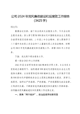 公司2024年党风廉政建设和反腐败工作报告(3425字)同志们:根据会议安排,接下来由我向大会报告工作。今天会议的主要任务是:深入学习贯彻XXX新时代中国特色社会主义思想,全面贯彻落实党的XXX、二十届二中全会精神,深入贯彻学习二十届中央纪委三次全会和十三届省纪委三次全会精神,回顾公司2023年党风廉政建设和反腐败工作,部署2024年工作任务。下面,我从两个部分报告工作。第一部分2023年工作回顾2023年是全面贯彻党的XXX精神的开局之年,X公司在X党委的正确领导下,始终高举XXX新时代中国特色社会主义思想伟大旗帜,以全面贯彻党的XXX精神为主线,以开展学习贯彻XXX新时代中国特色社会主义思想主题教育为重点,深学习、抓落实,始终以严的基调、严的措施、严的氛围强化政治监督、正风肃纪反腐,不断探索党风廉政建设和反腐败工作新举措,持续推动党风廉政建设和反腐败工作走深走实。一、聚焦两个维护,政治监督开创新局面公司党总支委始终坚持把政治监督摆在首位,严格落实第一议题制度,充分利用党员大会、中心组学习会议、主题党日活动,严格执行第一议题制度,用心用情深学细悟XXX新时代中国特色社会主义思想、党的XXX精神,推动党员干部在深化、内化、转化上下功夫,自觉从党的创新理论中找理念、找思想、找方法、找举措,做到学思用贯通、知信行统一。(一)坚持以上率下。公司党员领导干部作为落实全面从严治党主体责任的带头人、管党治党的示范者,带头着力从解决理论学习、政治素质、能力本领、担当作为、工作作风、廉洁自律等6个方面的突出问题,从政治、思想、能力、作风、纪律等方面进行党性分析、找准问题症结,对查摆出的问题,一项一项明确具体措施、整改时限、责任分工,确保整改到位,把主题教育探索的好经验好做法转化为长效机制,推动主题教育在基层党组织全面开花,推动全面从严治党向基层延伸、在基层见效,激活末梢神经。(二)压紧压实责任。公司各责任主体切实履行全面从严治党主体责任,贯彻落实公司党风廉政建设责任制实施细则、《党风廉政建设责任书》,并结合实际制订2023年党风廉政建设重点工作安排、印发党风廉政建设责任制实施办法、开展季度廉洁纪律教育学习等方式方法,把责任内容落实到岗、明确文可居文库——海量学习资料,手机电脑均可下载www.wenkeju.com到人、具体到事,构建责任明晰、履职尽责的责任体系,推动建立四责协同运行的责任体系。(三)夯实调研基础。公司持续深入开展党员干部下基层活动,激励党员在服务群众、奉献社会中发挥作用,组织公司班子成员采取确定主题、蹲点调研、督查调研、座谈调研的方式,扑下身子、沉到一线听取职工心声、工作实况、改革建议等,形成9大项目39条细项的问题清单,通过就地解决、及时协调、督办跟进、统筹落实的责任要求,注重调研成果转化运用,不断在调查研究中深化对党的创新理论的理解,有序推动调研成果上升为决策部署、转化为政策措施、固化为工作机制,助力解决突出问题、提高工作质效。二聚焦重点工作,日常监督实现新突破(一)从严开展四风自查自纠工作。根据上级纪委关于开展四风突出问题专项整治工作部署,结合工作实际从严从实开展纠治工作,紧盯关键少数、重点岗位和关键环节,重点排查违规商务招待、违规发放津补贴、差旅中车轮上的违规、形式主义、官僚主义四方面重点问题开展自查自纠,坚持纠四风与树新风并举,推动营造风清气正的政治生态。(二)纠树并举促进作风建设常态长效。公司自觉对标文可居文库——海量学习资料,手机电脑均可下载www.wenkeju.comXXXXXX重要指示批示精神,锲而不舍严格落实中央八项规定精神,强化元旦、春节、五一、中秋、国庆等重要节点监督,加强对党员干部开展理想信念教育、廉洁警示教育,时刻敲响廉洁钟、绷紧纪律弦、守好作风关。(三)扎实开展纪律教育学习。公司把纪律教育学习月活动纳入学习贯彻XXX新时代中国特色社会主义思想主题教育总体安排,通过中心组学习、三会一课、主题党日等组织生活载体,组织广大党员、干部深刻认识两个确立的决定性意义,深入学习领会XXXXXX关于党的自我革命重要思想以及关于廉洁文化和家庭家教家风建设的重要论述精神,以彻底的自我革命精神扣好廉洁从业的第一粒扣子,保持对腐蚀、围猎的警觉,永葆共产党人的政治本色。三、聚焦标本兼治,三不腐一体建设迈上新台阶公司党总支始终坚持严的主基调,持续正风肃纪反腐,坚持把学思想和强党性紧密结合起来,通过组织广大党员到X革命烈士纪念基地、X党群服务站、X廉洁教育基地开展党性教育。通过现场教学活动,教育引导广大党员干部坚持把XXX新时代中国特色社会主义思想作为牢记初心使命、砥砺前行的营养液、指明灯,进一步锤炼政治品格、