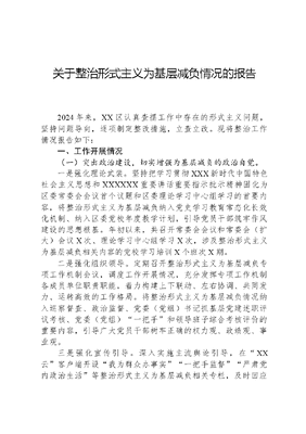 关于整治形式主义为基层减负情况的报告2024年来,XX区认真查摆工作中存在的形式主义问题,坚持问题导向,逐项制定整改措施,立查立改。现将整治工作情况报告如下:一、工作开展情况(一)突出政治建设,切实增强为基层减负的政治自觉。一是强化理论武装。坚持把学习贯彻XXX新时代中国特色社会主义思想和XXXXXX重要讲话重要指示批示精神固化为区委常委会会议首个议题和区委理论学习中心组学习的首要内容,将整治形式主义为基层减负纳入党史学习教育常态化长效化机制、纳入区委党校年度教学计划,引导党员干部筑牢作风建设的思想根基。年初以来,共召开常委会会议和常委会(扩大)会议X次、理论学习中心组学习X次,涉及整治形式主义为基层减负相关内容的党校学习培训X个班次X期。二是强化组织领导。定期召开整治形式主义为基层减负专项工作机制会议,调度工作开展情况,充分发挥专项工作机制各成员单位职责职能,着力构建上下联动、左右协调、共同发力、运转高效的工作格局。将整治形式主义为基层减负情况纳入巡察督查、政治监督、党委(党组)书记抓基层党建述职评议考核、党委(党组)一把手和领导班子综合考核评价的重要内容,引导广大党员干部树牢正确的权力观、政绩观、事业观。三是强化宣传引导。深入实施主流舆论引导,在XX云客户端开设我为群众办事实一把手监督严肃党内政治生活等整治形式主义为基层减负相关专栏,及时回应社会关切。持续发布党中央关于整治形式主义为基层减负相关政策要求和各部门单位工作成效,刊发《为基层减负,XXX这些话铿锵有力》《深入开展局长走流程活动》等相关信息,不断激励干部真抓实干、担当作为。四是主动接受监督。拓宽基层反映问题渠道,积极做好人民网网民留言和市长热线基层群众反映事项的办理工作,规范办理流程、提高办理效果,使之真正成为听民意、解民忧、办实事的连心桥。年初以来,共接到12345服务热线转派工单X件,响应数X件,响应率100%,解决数X件,解决率X%,满意数X件,满意率X%。(二)聚焦常规整治,巩固拓展为基层减负的治理成果。一是深入整治形式主义官僚主义。将整治形式主义为基层减负情况纳入政治监督重点内容,充分发挥监督合力,综合采用常规巡察、专项巡察、延伸巡察等方式对形式主义官僚主义问题进行深入监督,擦亮派驻监督探头。年初以来,共开展关于整治形式主义官僚主义相关巡察1轮,共查处形式主义、官僚主义相关问题线索X件,立案X件,给予党纪政务处分X人,通报曝光X批XX人。二是持续推进精文减会。召开全区公文管理与报备业务培训会,进一步提高公文规范管理水平。严格执行发文开会审批报备制度,建立月监测制度、减负工作台账,从严管控文件数量和全区性会议规模,区委办公室、区政府办公室及时对各部门目标完成情况进行跟踪通报。年初以来,共制发本级两类文件XX件、同比减少X%,召开全区性会议XX次,文风会风进一步好转。三是统筹规范督查考核。统筹XX各项督查检查考核计划,严格控制总量,制定《XX2024年度督查检查考核计划》,每月对各乡镇、街道接受区级督查检查考核情况进行摸底调查。今年以来,各单位上报年度督查检查考核事项共计XX条,经反复研判后精简合并为XX条,比上年度计划数同比减少X文可居文库——海量学习资料,手机电脑均可下载www.wenkeju.com%。截至目前,接收计划内督查检查考核备案报告XX项。四是切实改进调查研究。积极构建大调研工作格局,建立经常性调查研究制度,对所有乡镇开展全覆盖式乡村振兴调研。统筹安排调研活动,不集中或轮番到一个地方、一个点、一条线路去调研,调研过程中不搞陪同,调研乘车及用餐一切从简,促进了工作作风进一步好转。县级领导同志每月调研和现场办公时间均不低于当月工作日的1/3,年初以来,各常委累计开展调研指导工作XX余次、XX余天。五是持续增强基层党组织活力。简化基层报表事项,采取一表多用、多信息合一、定期更新模式,有效避免相同信息重复统计情况出现,减轻村级组织行政管理事务过多负担。优化精简村干部培训,推动对X名村党组织书记培训全覆盖、镇级对村两委成员和农村党员培训全覆盖。强化基层基础保障,今年以来,已完成村干部工资和离任老干部补贴经费审核和发放工作,共发放经费XX万元。六是持续整治指尖上的形式主义和创建示范活动中的形式主义。在完成移动互联网应用程序整治清理工作的基础上,要求各部门各单位建立健全政务APP、微信工作群内部管理制度,实行实名准入制度,规范信息发布。常态化开展监督检查,定期开展整治指尖上的形式主义回头看工作,确保基层减负取得实效。(三)紧盯重点领域,持续提升为基层减负的工作效能。一是激励党员干部担当作为。加大正向激励力度,持续完善干部考核评价机制,深入开展激励干部担当作为三个专项行动,制定《关于贯彻落实