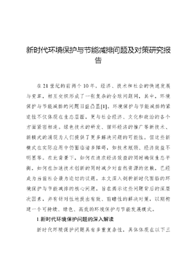 新时代环境保护与节能减排问题及对策研究报告在21世纪的前两个10年,经济、技术和社会的快速发展与变革,相互交织形成了一张复杂的全球问题网,其中,环境保护与节能减排的问题日益凸显[1]。环境保护与节能减排的紧迫性不仅体现在生态层面,更与社会经济、文化和政治的各个方面紧密相连。绿色技术的研发、循环经济的推广等新技术、新模式的涌现为人们提供了更多解决问题的可能性。但这些新模式在实际应用中仍面临诸多障碍,如技术瓶颈、经济效益不明显等。在此背景下,如何在追求经济效益的同时确保生态平衡,如何在加速技术创新的同时减少对自然资源的依赖,已经成为当前社会最为迫切的议题。本文深入剖析新时代面临的环境保护与节能减排的核心问题,旨在揭示这些问题背后的深层次因素,并有针对性地提出有效、前瞻性的解决对策,以期构建一个可持续、绿色、高效的环境保护与节能发展模式。1.新时代环境保护问题的深入解读新时代环境保护问题具有多重复杂性,具体体现在以下三个方面。第一,公众的环境保护意识较为薄弱,在深层次上反映了现代消费文化与环境教育之间的缺口。过度消费、随意弃置垃圾等日常行为背后,实际上是对资源的低效率利用与对生态价值的忽视。当这种忽视在社会范围内被放大,它们对生态系统的破坏将呈现指数级的增长,导致生态服务功能下降,进而威胁到人类的福祉与生存质量。第二,现存的环保法规政策存在一定的不足之处。首先,部分法规制定过程中未能充分考虑到环境变化的快速性与不确定性,导致部分法规在应对新型环境问题时显得力不从心。另外,环保执行力度的不均衡和监管机制的滞后,使得部分危害环境的行为在长期内得以逍遥法外,进一步加剧了环境恶化的趋势。第三,生态文明建设的难题在于如何将理念与实践有效衔接。过度的资源开发与生态环境的持续恶化是现代工业文明的副产品。在这背后,更深层次的问题是如何在高度现代化的社会中,确立与自然和谐共生的文明理念。而这与传统的开发型价值观存在着冲突,需要在理论与实践两个层面进行深入的思考与探索。2.新时代节能减排问题的多维分析文可居文库——海量学习资料,手机电脑均可下载www.wenkeju.com第一,尽管可再生资源具有显著的环境优势,但目前对其挖掘和利用的力度显著不足,导致非可再生资源的消耗速度不断超出可持续范围,从而形成了能源供应的依赖性,限制了能源转型的步伐,加大了对环境的压力。第二,在技术领域,当前的节能减排技术水平相对滞后。不仅导致了节能减排效果的减弱,还为产业升级带来了阻力,难以实现最大化的效能,进一步加剧了环境负荷。第三,从产业结构角度看,部分高耗能、高排放的行业在经济体中仍占据主导地位,而新兴的低碳产业尚未形成足够的规模与影响力。这不仅导致了碳排放量的持续增长,还对资源利用效率产生了负面影响。3.新时代加强环境保护的多元策略3.1完善环保法规政策,增强企业的环境保护动力实现解决环保法规制定过程中存在的问题,强化环境保护的目标,重点在于调整环保法规与监管策略。首先,环保部门应聚焦变动最为迅速且具有高度不确定性的环境领域,例如温室气体排放或新型有害物质的流入,积极制定专项研究计划,并在一定时间间隔内对计划进行审查和更新,以确保其与当前的科学研究和技术发展保持同步。其次,相关部门可以定期与本地及外地的环保组织进行沟通与交流,汲取其在应对新型环文可居文库——海量学习资料,手机电脑均可下载www.wenkeju.com境问题上的经验和策略,为本地法规的制定与完善提供参考和指导。针对监管层面,可以建立一个环保快速响应团队,专门负责监控并对新出现的环境问题进行快速评估,确保监管措施能够及时跟上环境的变化。同时,对于已知的环境违法行为,环保部门要加强日常巡查频率,并与地方政府及相关部门合作,建立联动机制,确保违法行为能够被及时查处。与此同时,为增强企业参与环境保护的积极性,环保部门应深入研究,积极设立并实施绿色技术与产品的激励策略。首先,构建严格且详实的绿色认证标准,该标准应涵盖生产过程中的资源利用、排放控制、产品的可持续性等多个维度,以用于选择真正遵循环保理念的企业与产品。在此基础上,环保部门将为经过审核并达到该标准的企业与产品,提供一系列的财政与税务优惠,如目标性的税收减免和直接的研发补贴。其次,环保部门可以与主要金融机构展开紧密合作,为符合绿色标准的企业提供专项的低息贷款,进而减轻其在创新与转型过程中的资金压力[3]。最后,推广绿色采购政策,确保政府和大型公共机构优先购买已获绿色认证的产品,从而形成市场推动效应,构建一个有机互动的激励体系,推动企业主动拥抱绿色技术与产品,从而达成环境保护的长远目标。3.2开展环保教育活动,引导公众从被动参与者转变为环保文可居文库——海量学习资料,手机电脑均可下载www.wenkeju.com倡导者面对