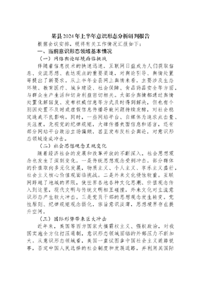 某县2024年上半年意识形态分析研判报告根据会议安排,现将有关工作情况汇报如下:一、当前意识形态领域基本情况(一)网络舆论环境面临挑战伴随着信息技术的快速迅速,互联网日益成为人们获取信息、交流思想、表达观点的重要渠道,对舆论引导、舆情处置等提出了新要求。从上半年全县网上舆情来看,主要涉及生态环境、教育医疗、城乡建设、社会保障、食品药品安全等方面,与群众生产生活和切身利益密切相关。大部分舆情都通过舆情处置化解回复、发布权威信息等方式及时得到解决,但也有个别因处置不及时或虚假信息传播导致问题持续发酵,对社会稳定造成不良影响。同时,一些网站平台、自媒体为追求点击量、关注度,无视党的纪律规矩,大肆传播负面信息和谣言,还有部分网站平台政治立场偏颇,甚至发布反社会舆论,对意识形态领域造成冲击。(二)社会思想观念呈现变化随着经济社会的发展和改革开放的不断深入,社会思想观念也发生了深刻变化。一是传统思想观念受到冲击。部分群体的价值取向多元化发展,物质主义、个人主义、享乐主义盛行,社会主义核心价值观面临挑战。二是外来文化侵蚀较重。互联网跨越了地域的界限,使世界各地各种文化思潮、价值观念传入到这里,现代文明与传统文明相互碰撞,外来文化对主流意识形态产生较大冲击。三是党员干部的思想观念发生转变。党性原则、纪律规矩观念弱化,宗旨意识淡薄,思想境界存在提升空间。(三)国际形势带来巨大冲击近年来,美国等西方国