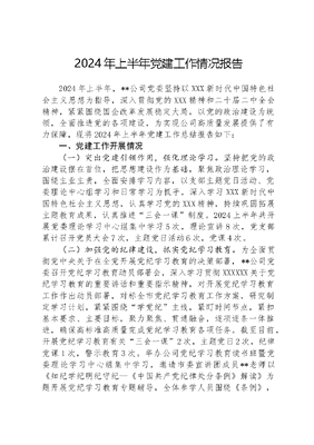 2024年上半年党建工作情况报告2024年上半年,**公司党委坚持以XXX新时代中国特色社会主义思想为指导,深入贯彻党的XXX精神和二十届二中全会精神,紧紧围绕国企改革发展稳定大局,以党的政治建设为统领,全面推进党的各项建设,为实现公司高质量发展提供了有力保障,现将2024年上半年党建工作总结报告如下:一、党建工作开展情况(一)突出党建引领作用,强化理论学习。坚持把党的政治建设摆在首位,把思想建设作为基础,聚焦政治理论学习,围绕主业主责,全面安排学习内容,以支部主题党日活动、党委理论中心组学习和日常学习为抓手,深入学习XXX新时代中国特色社会主义思想,认真学习党的XXX精神,持续巩固拓展主题教育成果,认真推进三会一课制度。2024上半年共开展党委理论学习中心组集中学习5次,理论宣讲8次,党支部累计召开党员大会7次,主题党日活动6次,党课4次。(二)加强党的纪律建设,抓实党纪学习教育。为全面贯彻党中央关于在全党开展党纪学习教育的决策部署,**公司党委召开党纪学习教育动员部署会,深入学习贯彻XXXXXX关于党纪学习教育的重要讲话和重要指示精神,对开展党纪学习教育工作作出动员部署,对标全市党纪学习教育工作方案,研究制定学习计划,紧紧围绕学党纪主线,紧盯时间节点,紧扣基本要求、主要目标,聚力聚焦、贯通融合,逐项逐条一体推进,确保高标准高质量完成党纪学习教育各项任务。截至目前,开展党