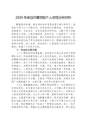 2024年参加市委党校个人党性分析材料根据组织安排,我有幸参加市委党校第X期X班学习,虽然仅仅学习3个月的时间,但党校通过专题讲座、名著导读、实地教学、小组讨论、双向交流等多种形式,让整个学习过程既紧张又充实,让我受益匪浅、收获良多。让我经历了一次深刻的思想洗礼和党性锤炼。通过系统的学习和深入的思考,我对自身的党性有了更为清晰和全面的认识。围绕近期学习内容,我深学细悟、深入反思、深刻剖析,认真查找了存在的不足及原因,明确了今后努力方向。一、存在的主要问题(一)理论学习还有差距。虽然我平时也会主动学习党的理论知识,但有时候还缺乏深入性和系统性,对一些重要理论的理解和把握还不够透彻。一是学习自觉性不够高。有时因为工作繁忙,减少了学习频次和深度,仅停留在抽象性、概念性的层面上,对理论的背景、内涵、内容、意义等方面的研究还不够深入。二是转化学思践悟的成果有待进一步拓展。面对新时代X工作面临的新形势新任务新挑战,理论学习与实践运用之间的结合还不够紧密。特别是在运用党的最新理论成果指导基层信访工作方面,在推动思路变为出路、决策变为实践方面措施不多、力度不够,还有很大的提升空间。(二)党性锻炼不足。对照在党校的学习,分析解剖自己在党性党风、宗旨意识方面还存在不足。工作重心更多地放在日常工作的落实推进以及上级和领导交办的工作上,对群众关心的急难愁盼问题,关注关心得不够,跟踪问效的力度不够。