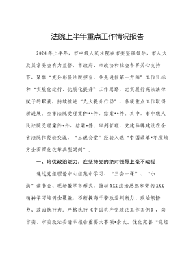 法院上半年重点工作情况报告2024年上半年,市中级人民法院在市委坚强领导,市人大及其常委会有力监督,市政府、市政协和社会各界关心支持下,聚焦充分彰显法院担当,争先进位第一方阵工作目标和实质化运行、优质化提升工作思路,忠实履行宪法法律赋予的职责,持续推进九大提升行动,各项重点工作取得新进展。全市法院受理案件**件,结案**件。其中,市中级人民法院受理案件*件,结案*件。审判管理、党建品牌建设在全省法院作经验交流,三说会堂经验入选中国改革*年度地方全面深化改革典型案例。一、培优政治能力,在坚持党的绝对领导上毫不动摇通过党组理论中心组集中学习、三会一课、小满读书会、现场教学等形式,推动XXX法治思想和党的XXX精神学习培训全覆盖,不断提高干警政治判断力、政治领悟力、政治执行力。严格执行《中国共产党政法工作条例》,向市委、市委政法委请示报告重要大事项*余次。优化完善党组—机关党委—党支部—党小组—党员上下联动机制,增强党组织凝聚力。二、培优大局意识,在助推高质量发展上担当作为服务共同富裕试验区建设。深入贯彻市委决策部署,制定《关于为*高质量发展建设共同富裕试验区提供司法服务和保障的意见》,推出强化区域司法协作、精准服务六大行动等*条细化措施。与*中院签订《司法服务保障*经济区高质量发展战略合作协议》,在耕地保护、绿色低碳优势产业、国际阳光康养旅游、公共服