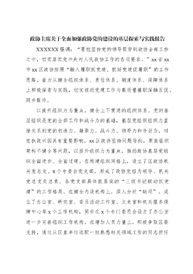 政协主席关于全面加强政协党的建设的基层探索与实践报告XXXXXX强调:要把坚持党的领导贯穿到政协全部工作之中,切实落实党中央对人民政协工作的各项要求。xx省xx市xx区政协按照融入履职抓党建、抓好党建促履职的工作思路,着力从健全组织体系、责任体系、制度体系、保障体系上积极探索与实践,切实推动党建工作与高质量履职深融互促、同步提升。以提升组织力为重点,健全上下贯通的组织体系。党的基层组织是党的全部工作和战斗力的基础,基层党组织组织力直接关系到党的创造力、凝聚力、战斗力、领导力和号召力,对党执政兴国具有重要影响。xx区政协坚持问题导向,聚焦组织架构不健全等问题,以提升组织力为重点,推动政协基层党组织全面进步、全面过硬。在构建组织网格上,设立了区政协机关党总支、x个专委会党支部,形成了政协党组为领导、机关党总支负总责、各党支部具体抓落实的三级书记联动抓党建的工作格局。在健全内设机构上,深入分析缺项,成立了办公室、研究室、委员活动工作室、文史室和机关服务保障中心等x个工作机构,同步在x个专门委员会设立了办公室进一步完善组织工作机构。在增加人员力量上,积极争取区委支持,通过从区直单位选配一批熟悉相关领域工作的同志担任专委会负责人,增加x个机关编制,机关科室人员一人双岗等方式,实现了一人一委向多人一委的转变。以提升联动力为主线,健全执行有力的责任体系。XXXXXX指