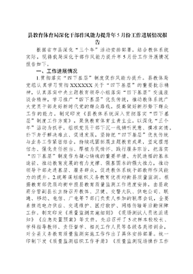 县教育体育局深化干部作风能力提升年5月份工作进展情况报告根据省市县深化三个年活动安排部署,结合教体系统实际,现将我局深化干部作风能力提升年5月份工作开展情况报告如下。一、工作进展情况1.贯彻落实四下基层制度促作风能力提升。县教体局党组认真学习贯彻XXXXXX关于四下基层的重要批示精神,认真落实中央主题教育领导小组落实四下基层交流座谈会精神,学习推广四下基层优良传统,推动教体系统广大党员干部走好新时代党的群众路线,提高做好新形势下群众工作的能力。制定印发《县教体系统深入贯彻落实四下基层制度工作方案》,聚焦教育体育主责主业,以深化三个年活动为抓手,组织党员干部下沉一线倾听民意、摸准实情,扑下身子解决难点、促进发展,坚持把四下基层优良传统与业务工作紧密结合,持续巩固拓展主题教育成果,坚定理想信念、强化责任担当、厚植为民情怀、践行服务宗旨,把落实四下基层制度作为凝心铸魂的重要举措、为民造福的基本途径、推动教育发展的有力支撑、强基固本的强大推力,推动领导干部走进基层、服务群众,促进教体系统干部教师作风能力的提升。2.统筹谋划组织义务教育优质均衡县质量监测。根据教育部优质均衡申报县教育质量监测工作进度安排,由县政府分管副县长主持召开教体、卫健、交警大队、供电公司、联通、移动、电信、广电等7部门负责人参加的联席会议,全要素推进电力供应、交通维护、医疗救护、网络