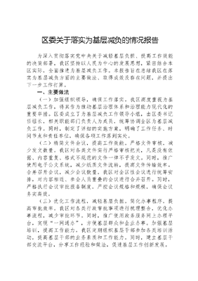 区委关于落实为基层减负的情况报告为深入贯彻落实党中央关于减轻基层负担、提高工作效能的决策部署,我区坚持以人民为中心的发展思想,紧密结合本区实际,全面推进为基层减负工作。本报告旨在总结我区在落实为基层减负方面的主要做法、取得成效及存在问题,并提出下一步工作打算。一、主要做法(一)加强组织领导,确保工作落实。我区高度重视为基层减负工作,将其作为推动基层治理体系和治理能力现代化的重要举措。区委成立了为基层减负工作领导小组,由区委书记任组长,相关职能部门负责人为成员,统筹协调全区为基层减负工作。同时,制定了详细的实施方案,明确了工作任务、时间节点和责任单位,确保各项工作落到实处。(二)精简文件会议,提高工作效能。严格文件审核,减少发文数量。我区对各类文件实行严格审核把关,凡是没有依据、内容重复、格式不规范的文件一律不予发文。同时,推广使用电子公文系统,减少纸质文件流转,提高文件传输效率。合并召开会议,减少会议数量。我区对全区性会议进行统筹安排,对内容相近、参会人员重叠的会议进行合并召开。同时,严格执行会议审批报备制度,严控会议规格和规模,确保会议务实高效。(三)优化工作流程,减轻基层负担。简化办事程序,提高审批效率。我区对各类行政审批事项进行梳理整合,优化办事流程,减少审批环节。同时,推广使用政务服务网上办理平台,实现一网通办,方便基层群众和企业办事。加强基层培训,提高工作能力。我区定