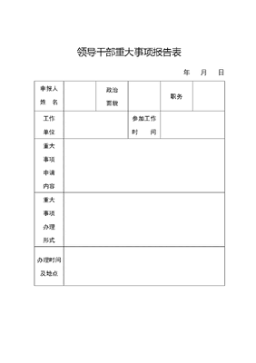 领导干部重大事项报告表年 月 日申报人姓名政治面貌职务工作单位参加工作时间重大事项申请内容重大事项办理形式办理时间及地点本单位审核意见审批机关意见文可居文库——海量学习资料,手机电脑均可下载www.wenkeju.com