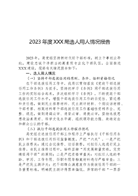 2023年度XXX局选人用人情况报告2023年,局党组坚持新时代好干部标准,树立干事创业导向,建设忠诚干净担当的高素质专业化干部队伍,全面推进XXX建设,现将有关情况报告如下:一、选人用人情况(一)坚持干部选拔任用的原则、条件、任职资格情况在干部选拔任用工作中,我局以贯彻落实《党政干部选拔任用工作条例》为抓手,坚持把学习《条例》同干部选拔任用工作的实际结合起来,多次组织学习《条例》,不断提高干部选拔任用工作水平,增强干部选拔任用工作的自觉性、紧迫感和责任感,做到民主推荐材料、民主测评材料、个别谈话材料、干部考察、档案材料等干部选拔任用工作基础性资料齐全、完整、规范,做到逢调必审、逢晋必审、逢提必审,坚持选拔思想政治素质好、科学文化水平高、组织领导能力强、政绩突出和群众公认的干部。(二)执行干部选拔任用工作程序情况局党组在选拔任用干部工作程序上严格执行《干部任用条例》和干部选拨任用四项监督制度。严把六关。一是严把民主推荐关:通过会议推荐、谈话推荐,对拟任人选进行民主推荐。在民主推荐过程中,始终坚持用发展衡量实绩,凭实绩任用干部的原则;二是严把资格审查关:对拟任人选的年龄、学历、工作年限、任职年限等档案材料进行严格审查;三是严把民主测评关:把干部群众满意度作为提拔任用干部的一条重要标准,明确民主测评得票率偏低、异常的干部一票否决;四是严把组织考察关:对拟提拔任用干部的德、能、勤、绩、廉进行全面考察,充分征求纪检、平安建设部门的意见;五是严把公示关:把被考察对象基本情况、简历、反应情况、联系方式等内容予以公告,把选拔任用干部全过程置于全体干部职工的监督之下,有效防止了干部带病提拔;六是严把讨论决定关:坚持民主讨论、集体决策的原则,党组书记带头发扬党内民主,不搞一言堂,不搞临时动议,严格按照规定办事。真正用科学的制度、民主的方法、良好的作风、严格的纪律,把好选人用人关。2023年调整的干部共计X人,其中X名县级干部转正考核,提拔行政科级干部X名、事业单位科级干部X名,交流事业单位科级干部X名,全部符合规定程序,群众普遍满意。(三)贯彻执行党的干部选拔任用方针政策的主要做法一是党组始终坚持认真执行《中国共产党党内监督条例(试行)》《干部选拔任用条例》及《党政领导干部选拨任用工作责任追究办法(试行)》等四项监督制度。二是在实际工作中注重品德,选拔靠得住的人。坚持把政治标准放在首位,加强对干部思想政治素质的考察,全面了解其工作圈、生活圈、社交圈,坚决克服重才轻德现象,防止干部带病上岗。三是在干部选拔任用工作中,充分发扬民主,走群众路线,认真落实群众在选拔任用干部中的知情权、参与权、选择权和监督权,从而杜绝了在少数人中选人的现象,进一步增强了干部工作的透明度。四是进一步完善干部考核机制,年度进行公开述职,量化打分,综合排名。科学评价干部,准确用好干部,关心爱护干部,激励干部干事创业。五是注重选人用人向任务一线倾斜,聚焦交通强市建设、疫情防控等重点任务一线选人用人。六是紧盯年龄结构、专业结构、知识结构、党派结构及性别结构。局党组高度重视年轻干部、非党干部、女性干部等培养选拔工作,在2023年提拔的干部中包括女干部X名、35周岁以下干部X名。文可居文库——海量学习资料,手机电脑均可下载www.wenkeju.com二、存在的问题及改进措施一是干部结构不合理的情况依旧存在,干部队伍老化的现象比较严重,85后科级干部仍然偏少,仅占干部队伍的十分之一,全日制本科以上学历的科级干部仅占四分之一,队伍学历不高的问题依然比较突出;二是机制建设仍然不完善,创新考察干部、选用干部、培养干部还存在差距,没有形成成熟的机制,干部队伍活力不强、动力不足的问题依然存在。三是对探索推进一线工作人员与选人用人结合起来的方法不够。文可居文库——海量学习资料,手机电脑均可下载www.wenkeju.com