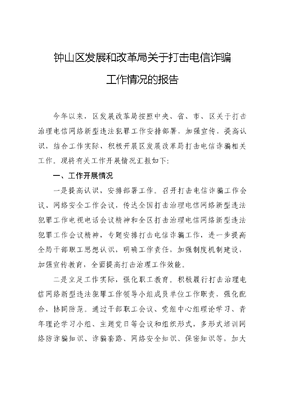 钟山区发展和改革局关于打击电信诈骗工作情况的报告今年以来,区发展改革局按照中央、省、市、区关于打击治理电信网络新型违法犯罪工作安排部署,加强宣传,提高认识,结合工作实际,积极开展区发展改革局打击电信诈骗相关工作。现将有关工作开展情况汇报如下:一、工作开展情况一是提高认识,安排部署工作。召开打击电信诈骗工作会议、网络安全工作会议,传达全国打击治理电信网络新型违法犯罪工作电视电话会议精神和全区打击治理电信网络新型违法犯罪工作会议精神,专题安排打击电信诈骗工作,进一步提高全局干部职工思想认识,明确工作责任,加强制度机制建设,加强宣传教育,全面提高打击治理工作效能。二是立足工作实际,强化职工教育。积极履行打击治理电信网络新型违法犯罪工作领导小组成员单位工作职责,强化配合,协同防范。通过干部职工会议、党组中心组理论学习、青年理论学习小组、主题党日等会议和组织形式,多形式培训网络防诈骗知识、诈骗套路、网络安全知识、保密知识等,加大干部职工宣传教育,增强对网络诈骗的警惕意识和防范意识。三是线上线下宣传,营造浓厚氛围。组织区发展改革局志愿者、党员同志,结合机关联基层活动,深入朝阳社区,开展线下打击电信诈骗志愿宣传活动。今年以来,共开展打击电信诈骗志愿宣传活动5次;依托钟山发改微信公众号,开展反诈宣传6次,发动全局干部职工积极转发反诈宣传信息至微信群、朋友圈,积极推广国家反诈中心APP应用,营造浓厚反诈氛围,引导群众参与到打击电信诈骗行动中来,提高防范意识,筑牢思想安全防火墙。二、下一步工作打算在今后的工作当中,区发展改革局将进一步加强反诈宣传力度,进一步提升干部职工思想认识,积极参与反诈宣传工作,持续推进打击电信诈骗工作向纵深发展。 钟山区发展和改革局2022年4月12日文可居文库——海量学习资料,手机电脑均可下载www.wenkeju.com