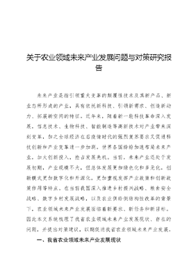 关于农业领域未来产业发展问题与对策研究报告未来产业是指引领重大变革的颠覆性技术及其新产品、新业态所形成的产业,具有依托新科技、引领新需求、创造新动力、拓展新空间的特征。近年来,随着新一轮科技革命深入发展,信息技术、生物科技、智能制造等高新技术对产业带来深刻变革,加之全球经济在后疫情时代的强烈复苏要求又促进科技创新和产业变革进一步加剧。世界各国纷纷加速布局未来产业,加大创新投入,抢占发展先机。当前,未来产业还处于发展初期,产业规模不大,但总体发展更加绿色化和多元化,创新模式更加数字化和开源化,更加重视发挥产业政策和创新政策作用等特点。在当前我国深入推进乡村振兴战略、粮食安全战略、数字乡村发展战略,以及农业供给侧结构性改革的背景下,农业领域未来产业发展面临着新要求、新任务和新目标。因此本文系统梳理了我省农业领域未来产业发展现状、存在的问题,并提出对策建议,以期促进我省农业领域未来产业发展。一、我省农业领域未来产业发展现状(一)顶层设计布局未来产业集智能化、数字化、绿色化为一体,是技术与产业高度融合的产物,具有极强的关联性和带动性,其发展可以辐射周边产业,为传统产业带来新机遇、赋予新动能;也可以将几个产业进行融合,帮助其快速迭代,加速新产业演化,制造新消费需求,创造新应用场景。近年来,我省为布局发展农业领域未来产业陆续发布了《xx省现代农业发展规划(2018-2022年)》《xx省十四五时期农业农村现代化发展规划》《xx省新一代信息技术产业发展规划(2021-2025)》等文件。近期xx省委发布的《xx全面振兴新突破三年行动方案(2023-2025)》指出,坚持农业农村优先发展,在全面推进乡村振兴上实现新突破。这一系列政策文件表明了我省发展农业的信心和决心,为农业领域未来产业的发展提供了遵循和路径。现阶段,xx省农业领域未来产业规划主要聚焦于发展现代农业和农村产业,加快转变农业发展方式,构建现代农业产业体系,促进农业与其他产业的深度融合等方面,旨在推动农业产业的可持续发展。(二)典型案例1.发展有机农业。大力发展有机农业,推广有机农业生产文可居文库——海量学习资料,手机电脑均可下载www.wenkeju.com技术,大力发展有机肥料、有机农药等有机农业生产资料,建立了一批有机农产品示范区和认证机构,培育了xx嘉善园有机农业有限公司、阳光有机农业生态园、xx绿美有机农业科技有限公司、大连广大有机农业科技有限公司、xx润田有机农业有限公司等一批有机农产品品牌,提高了农产品质量和安全性,推进了农业绿色化、品牌化和生态化发展。2.推进盘锦市水稻种植智能化。推进盘锦水稻种植智能化,通过引进智能种植、精准施肥、精准灌溉等技术,实现了对水稻种植全过程的智能化管理,提高了水稻种植的效率和质量,推进了农业现代化和智慧农业发展。3.发展现代畜牧业。大力发展现代畜牧业,培育了xx安心奶牛xx绿之源畜牧xx正大畜牧xx宏海畜牧xx宏业畜牧等典型代表,促进了畜牧业向现代化、规模化、绿色化方向发展。4.发展现代渔业。大力发展现代渔业,涌现出葫芦岛渔业产业园等典型代表,通过加强水产育种、养殖、加工等环节的技术创新,推进了渔业产业的升级和转型。5.发展农村电商。大力发展我省农村电商,打造了鲜城道农爱无忧稻花香乡村汇等一批电商平台;以文可居文库——海量学习资料,手机电脑均可下载www.wenkeju.com及金博士大米抚顺大枣沈阳大樱桃辽河莜麦菜等知名网销农产品品牌;开展xx优质特色农产品线上推介活动,仅新浪微博平台总曝光量就达到7900万次。推进了农村电商模式创新,提高了农产品销售渠道和效率,促进了农产品品牌化和产业升级。6.建设沈阳市农业科技园区。沈阳市农业科技园区是xx省重点建设的农业科技创新平台,集聚了一批农业科技创新机构和企业,推进了农业科技创新和产业化发展,培育了一批农业科技成果和企业,推动了农业现代化和产业升级。二、我省农业领域未来产业面临主要问题未来产业发展方兴未艾,现阶段发展方向不清晰、技术应用不成熟、发展路径有待探索。地方政府应前瞻性地进行提前布局,精心谋划,加大培育力度,用好技术驱动与市场拉动、政府干预三种手段。(一)引导性政策居多,可操作性细化不够未来产业发展需要经过技术创新、产品试验、试点推广、进入市场等多个阶段,每个阶段都需要有针对性的政策扶持。我省已开始顶层设计谋划,但激励性、引导性政策居多,在实际操作层面政策不够细化。文可居文库——海量学习资料,手机电脑均可下载www.wenkeju.com(二)鼓励创新的体制机制不完善技术创新是未来产业发展的先决条件,技术创新需要良好的社会环境,需要完备的体制机制作为保障。政策、资金、制度、政府干预都