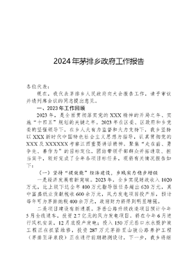 2024年茅排乡政府工作报告各位代表:现在,我代表茅排乡人民政府向大会报告工作,请予审议并请列席会议的同志提出意见。一、2023年工作回顾2023年,是全面贯彻落实党的XXX精神的开局之年、实施十四五规划的关键之年。2023年在区委、区政府和乡党委的坚强领导下,在乡人大有力监督和大力支持下,我乡坚持以XXX新时代中国特色社会主义思想为指导,认真贯彻党的XXX及XXXXXX考察江西重要讲话精神,聚焦走在前、勇争先、善作为的目标定位,团结带领干部群众开拓进取、担当实干,较好完成了全年各项目标任务,现将有关情况报告如下:(一)坚持提效能经济建设,乡域实力稳步增强一是经济发展有新突破。2023年,全乡实现财政收入1020万元,比上级下达全年400万元指导性任务超出620万元,其中富盛纸业贡献税收600余万元,风力发电项目投产后,预计每年可为茅排纳税400余万元,政府财力将得到明显增强。二是项目建设有新进展。茅岳公路升级改造项目预计今年5月全线通车,投资2.7亿元的风力发电项目,将在今年6月进行风机安装,12月底投产发电;投入150万元岳口水水毁护坡工程正在抓紧维修,投资287万元茅排至山陂公路养护工程(茅排至泽泉段)正在进行前期勘测设计,下一步,我乡将继续向上级部门争取路面改造资金,将泽泉至山陂剩余路段升级改造;这些项目的实施将为茅排的高质量发展打下坚实的基础。(二)坚持抓产业、促振兴,和美乡村加快推进。一是持续夯实粮食安全根基。全方位夯实粮食安全根基,扎紧耕地保护篱笆,落实最严格的耕地保护制度,严守耕地红线,坚决遏制耕地非农化、防止非粮化,稳定粮食种植面积,完成中稻种植面积1084亩,流转农田520亩,恢复耕地243亩;积极调整农业产业结构,探索种植莲子、菌菇等适合山区的农作物。二是产业带动不断增强。立足乡情实际和发展现状,聚焦优势积极发展特色农业,投入资金23万元,采取村办公司+致富带头人的模式在庄前村种植茶树菇,在带动3户脱贫户就业的同时为村集体经济增收4万元。山陂村黑山羊产业连续4年为9户脱贫户每年分红1000元以上。2023年,全乡5个村集体经济收入稳定增长,5个村收入均超过15万元,其中山陂村达30万元,茅排村、庄前村达20万元。三是持续巩固拓展脱贫攻坚成果。始终把巩固拓展脱贫攻坚成果摆在压倒性位置,控辍保学持续动态清零。全年发放小额信贷30笔89.3万元,村级光伏发电累计收益22.8万元,紧盯两不愁四保障和饮水、住房安全核心指标,扎实开展防返贫动态监测工作,做到应纳尽纳。目前,全乡共有监测户2户7人,均落实了精准帮扶措施,其中1户3人已消除返贫致贫风险,全乡脱贫人口实现人均收入过万。四是乡村面貌日新月异。紧盯急难愁盼、倾力为民解忧,高质量推进美丽乡村建设让乡村更有活力。集镇内群众休闲广场、灯光篮球场相继投入使用,争取政策资金300余万元,以山陂村为重点,持续开展村庄环境整治提升工程,实现山陂村村内道路全部白改黑,新建拦洪堤,改建村内池塘、村民文可居文库——海量学习资料,手机电脑均可下载www.wenkeju.com活动广场,整个村庄面貌焕然一新。分类有序抓好问题厕所整改,新改建农村户厕21个,全乡人居环境显著改善。(三)坚持抓实事、惠民生,人民生活更加幸福。一是茅岳公路全线通车在望。茅岳公路升级改造是全乡群众期盼已久的最大民生工程,经过一年多的紧张施工,目前茅岳公路茅排段已全面建成,南城段也已完成总工程量的85%,整条公路计划在今年5月实现全线通车。二是基础设施进一步完善。投入50余万元新建茅排村党群服务中心、投入20余万元改造庄前村党群服务中心,将党群服务中心打造成服务群众的主阵地,高质量落实各项惠民服务,争取资金20余万元,在茅排村黄家组、里外科组、庄前村庄前组安装路灯70余盏,争取资金150万元,对茅岳公路临水、临崖路段安装了护栏、警示牌等,有效保障了我乡群众出行安全。三是文体事业进一步提升。积极完善教育基础设施建设,茅排中学建设橡胶跑道1500余平方,整治操场面积600平余方,办学条件大幅提升,投入30多万元加强乡村两级新时代文明实践场所的软硬件建设,添置相关器材,群众文化生活日益丰富多彩。四是民生保障进一步稳固。我们始终坚持以人民为中心的发展思想,把更多的资金、更好的资源投入到民生领域,让发展成果更多更公平地惠及群众。全年累计发放各类保障金183.22万元。其中发放农村低保金137.988万元、城镇低保金2.22万元、临时救助资金4.25万元、残疾两项补贴11.52万元、特困供养金16.167万元、高龄补贴金8.568万元、孤儿补助金2.5万元,惠及困难群众432余人。(四)坚持抓整治、守红线,生态环境持续向好一是坚决打好污染防治攻坚战。以XXX生态文明思想为根本