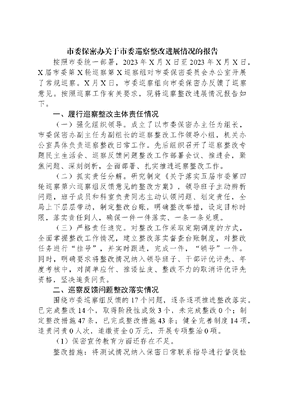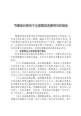 市委组织部关于巡察整改进展情况的报告根据X届省委第X轮巡视期间巡视巡察联动工作安排,以及X市委巡察工作统一部署,2023年X月X日至X月X日,X市委第X巡察组对X市委组织部进行了巡察。2023年X月X日,巡察组向X市委组织部反馈了巡察意见。按照党务公开原则和巡察工作有关要求,现将巡察整改进展情况报告如下。一、巡察整改主体责任落实情况X市委组织部坚持把巡察整改工作作为一项重大政治任务,严格按照整改方案既定措施,不折不扣地把各项整改任务落到实处。(一)加强组织领导,高位推动整改。迅速成立巡察整改工作领导小组,同步设立巡察整改工作领导小组办公室,牵头做好巡察整改的工作安排、协调推动、跟踪督办、材料报送等各项工作,形成了由部务会牵头抓总、各科室协同联动、科室负责人全员参与的巡察整改工作组织架构。(二)细化任务分解,压实整改责任。召开部机关落实X市委巡察反馈意见整改任务和责任分工会议,将巡察反馈意见和问题清单细化分解到相关科室和责任人,条条细化整改措施。高标准制定整改方案,明确整改时限、责任领导、责任部门和责任人,形成可量化、可检视、可追责的巡察整改任务书和时间表,确保整改责任层层落实。(三)动态跟踪督办,确保整改到位。部机关主要领导认真履行巡察整改工作第一责任人职责,亲力亲为抓督导。建立周报告、月调度工作机制,分管领导经常关注并推进分管条线的巡察整改工作,每周报告分管领域巡察整改进展情况;相关科室每月梳理整改任务落实情况并进行汇报。实行整改销号制度,办公室经常督促提醒,动态跟进各项整改任务落细落实。(四)健全长效机制,提升整改成效。进一步完善部机关内部管理制度,着力构建有效管用、简便易行的制度体系,切实做到以制度管权管事管人。把抓整改融入日常工作,紧盯关键重点,注重举一反三,组织各科室常态化有针对性地自查弱项、边查边改,形成自查整改长效机制,做到整改到位不反弹、防患于未然。二、巡察整改进展情况(一)学习贯彻党的XXX精神不够到位,紧贴中心大局践行新时代党的组织路线有差距1.关于学习领会新思想不够全面深入问题的整改情况。一是完善领学导学制度,利用月度办公会、部理论学习中心组(扩大)学习会契机,由部领导、业务骨干担任轮值讲师,带领组工干部研学党的XXX报告、党章等学习资料。常态督促各支部通过三会一课主题党日等形式,组织党员跟进学习党的创新理论。二是组织开展争创服务高质量发展先锋队主题实践活动,指导职能部门围绕全市中心工作制定服务清单、服务举措。认真落实四下基层制度,推进组工干部驻点调研,跟踪记录干部在应对紧急突发事件时的政治担当、工作实效等情况。对基层的好做法、好经验及时总结提炼、宣传推广,央视、《人民日报》、《光明日报》、《新华日报》及省市党媒多次推介X特色做法。三是出台《关于进一步发挥组织优势争当四敢先锋的若干举措》,开展四敢主题征文、典型宣讲、网络展示、担当有为好干文可居文库——海量学习资料,手机电脑均可下载www.wenkeju.com部评选等活动,宣传四敢先进典型,激发组工干部工作干劲。开展X组工大学堂、夜学堂、e学堂三联学堂,持续锻造堪当重任的高素质专业化组工尖兵。2.关于全方位发挥党建引领作用不够充分问题的整改情况。一是下发《全市经济薄弱村双提行动工作方案》,推动经济薄弱村结构提优、收入提速。组织开展村党组织书记全员轮训,举办发展村级集体经济擂台赛,引导村党组织书记拓宽发展集体经济的思路眼界、增强发展集体经济的能力活力。二是实施两新组织双有提升计划,部署底数排查、集中攻坚、巩固提升三大行动,实现党建情况大起底。把两新组织双有提升计划推进情况列为基层党建季度监测重点内容,推动区镇、街道一企一策抓提升。三是举办全市国有企业党组织书记学习贯彻XXX新时代中国特色社会主义思想示范培训班,提高国有企业党组织书记的政治素质和业务能力。把相关市属国有企业党委列为书记抓基层党建述职评议单位,强化考核问效,督促国有企业把抓党建与抓业务有效统筹起来。专题召开2023年度市级机关党组织书记抓基层党建述职评议会总结经验、查找不足,压实机关党建主体责任。组织开展服务高质量发展先锋队、融合党建服务品牌、机关党建书记项目优秀典型评选工作,分类进行通报表彰,推动党建与业务深度融合。举办市级机关党组织书记学习贯彻XXX新时代中国特色社会主义思想培训班,不断提升机关党务干部业务能力。四是遴选党耀X党建品牌进行集中评审,评选出A、B、C三档品牌,通过梯次化评选去粗取精,真正发挥党建品牌引领作用。3.关于新时代人才引领集聚效应不够凸显问题的整改情况。文可居文库——海量学习资料,手机电脑均可下载www.wenkeju.com一是强化高端人才
