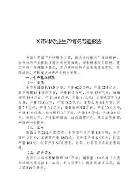 X市林特业生产情况专题报告为深入贯彻科技服务三农,助力乡村振兴行动精神,全市林特产业团队多措并举统筹推进,探索精准服务路径,建立和推广精准服务模式,努力确保林特产业发展落到实处、发挥成效,积极推进林特产业稳步发展。一、生产基本情况(一)水果全市果园面积86.9万亩,产量62.3万吨,产值52.4亿元。其中柑橘18.4面积万亩,产量19.2万吨,产值12.5亿元;杨梅面积33.4万亩,产量10.8万吨,产值11亿元;水蜜桃面积8.3万亩,产量76.8万吨,产值10.2亿元;蜜梨面积6.0万亩,产量7.6万吨,产值3.0亿元;葡萄面积9.8万亩,产量13.4万吨,产值10.0亿元;枇杷面积3.7万亩,产量1.5万吨,产值2.5亿元。相较去年,产业面积缩减,结构调整优化,果实品质提高,产值进一步提升。(二)茶叶茶园面积21.2万亩左右,全市茶叶总产量1.3万吨,总产值约9亿元,名优茶产量1863吨,名优茶产值6.6亿元,红茶产量164吨,红茶产值8902万元,红茶、白茶等多茶类发展迅速。(三)花卉苗木我市花卉苗木种植面积29.7万亩;销售量12.4亿株(主要包括绿化观赏苗木、盆花、鲜切花等);销售额31.2亿元,出口额310万美元。(四)其他林特产业全市竹林总面积127.4万亩,其中毛竹林面积119.1万亩,雷竹林面积6万亩,其他竹林面积2万余亩。笋干总产量为1.97万吨(鲜竹笋总产量即为19.7万吨,笋干产量按鲜笋产量10%折算),年产值约为6.9亿元。干果与木本油料作物总面积约6.1万亩,主要以香榧和油茶为主。其中香榧面积3.29万亩,青果产量0.147万吨,产值0.78亿元。油茶面积0.65万亩,油茶籽产量0.031万吨,茶油产量0.078万吨,产值0.14亿元。林下经营类型以林下种植为主,种植品种包括三叶青、黄精、铁皮石斛、浙贝母、灵芝、白芨等中药材和竹荪、黑皮鸡枞、羊肚菌、大球盖菇等菌菇。其中林下黄精种植收益较好,农户种植积极性高,今年种植发展迅速。二、工作举措及成效(一)开展技术支援服务,护航农业生产。持续开展林特产业技术指导和帮扶机制,随时做好农情调研调查,组织技术服务小分队确保自然灾害的应急服务工作,在持续低温阴雨、高温干旱、暴雨洪涝、台风、风雹、雨雪冰冻等极端气候来临前后,及时制定、发布林特业生产防灾减灾技术措施,组织、指导抗灾救灾及灾后恢复生产等工作,强化应急防范准备。根据果农生产需求赴象山、宁海、余姚、奉化、慈溪等地开展枇杷施肥、蜜梨整形修剪、葡萄促早栽培、杨梅矮化整形修剪等技术示范指导。走进茶园,实地查看春茶生产情况,并对茶农进行面对面、点对点技术指导服务,并且通过钉钉、微信群等平台发布《春茶生产将至,这些工作要抓紧》等生产信息,全年到基层各地直接指导服务农业主体100余次,重点抓好新型职业农民、家庭农场、农民专业合作社、科技示范户的技术指导和服务,推进林特业科技服务扎实高效的开展。针对性开展林下种植技术指导服务,重点开展林下套种黄精、三叶青等中药材及大球盖菇、羊肚菌、竹荪等食用菌的栽培技术示范和指文可居文库——海量学习资料,手机电脑均可下载www.wenkeju.com导,以理论教学、现场展示、大户带动等形式熟化栽培技术、提高作物产量,全年累计开展技术服务和指导60余人次,深入实施农村科技工作指导员制度,结对共建余姚市梁弄横坎头村,为村集体企业、合作社引进经济效益较高的日本甜柿、猕猴桃、樱桃、蟠枣等林特新品种和栽培新技术,护航农业生产,促进乡村共富。(二)加强先进实用技术示范推广,助推现代农业提质增效。通过参加市局举办的技下乡活动现场会,组织科研试验项目,推广良种良法措施,培育创新性示范基地,加快技术攻关研究,发布林特主导品种21个,主推技术12项,实现林特产业的高质量发展。开展了果树避雨设施栽培、大棚促早增效、矮化早果丰产等栽培技术推广,进行了红美人柑橘浅加温、葡萄加温设施栽培、阳光玫瑰葡萄设施栽培等试验示范,建立水果优质高效设施栽培试验示范基地,实现示范基地亩减损增收效益。积极推行一亩山万元钱富民模式,应用推广林下生态种植、香榧高效栽培等模式,以打造高质量、高标准、规模化林下中药材示范基地为抓手,大力推动优质林下道中药材种植基地建设,带动林下经济产业发展。全年举办果树、茶叶、林下种植栽培等技术培训班10余场,培训人数500人次以上。(三)推优引领产业,助力优质生产。开展第十一届中绿杯全国名优绿茶产品质量推选活动。本届中绿杯共收到来自全国19个省(自治区、直辖市)448家企业选送的绿茶有效样品575个。我市在本届中绿杯推选活动中,共有81家茶叶企业选送了91个茶样参加本届推选活动,获奖总数达63个,获奖率为69.23%,获奖率高出全国19个省(自治区、直辖市)平均水平近10