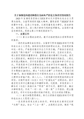 关于加强党的建设和落实全面从严治党主体责任情况报告2023年X镇党委坚持以XXX新时代中国特色社会主义思想为指导,全面贯彻党的XX大精神,围绕省委XXXX具体部署和市委、区委工作安排,以高质量发展为牵引,担当新使命,展现新作为,深入践行新时代党的组织路线,全面提升基层党建质效。现将主要工作情况报告如下:一、主要工作(一)着力加强政治建设,毫不动摇把党的全面领导落实到基层。一是把政治建设放在首位。全面学习贯彻XXX新时代中国特色社会主义思想,持续深化党的创新理论武装,坚持党的集中统一领导,严格落实意识形态工作责任制,严格执行省委坚决做到两个维护十项制度机制以及市委、区委有关要求,建立落实XXX的重要讲话、重要指示批示精神工作台账,落实专人跟踪落实,确保党中央决策部署贯彻落实到基层。二是扎实开展主题教育。召开党委理论学习中心组组集中学习研讨12次,开展党委书记讲党课8场次,发放学习材料460册,带动全镇开展理论学习、主题党日活动将近400场次,开展流动党员专题培训20场次,建立为民办实事工作清单,目前已销号68项,推动XXX新时代中国特色社会主义思想和党的XX大精神在家喻户晓、深入人心。三是巩固对村级党组织的全面领导。定期开展村(社区)书记打擂比武述职活动,提升基层党支部书记服务能力和履职本领。近距离、多角度深入了解各村(社区)换届以来两委班子运行、履职尽责、廉洁自