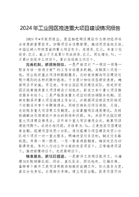 2024年工业园区推进重大项目建设情况报告2024年*市政府提出,要坚持把项目建设作为推动经济社会发展的重要抓手,加强项目全过程管理,推动项目落地见效。年园区纳入市级层面的重大项目有个,总投资.亿元,年度计划投资.亿元。截止于月底累计完成投资.亿元,同比增长.%。-月累计实现开工项目个,累计实现竣工项目个。完善机制,抓措施到位。一是严格实行一项目一领导一服务专班一推进方案的工作专班服务机制,定期深入项目一线,突出抓好重点项目的跟踪服务,及时有效解决项目建设过程中遇到的各种问题和困难,千方百计加快项目建设进度,确保项目早实施,早见效。年结合园区项目建设实际,核定印发园区统筹推进重大项目建设计划批次,新成立单个重大项目推进服务专班个;二是严格落实重大项目四级协调服务机制,坚持定期召开重大项目推进工作会议,并根据项目建设实际情况不定期召开单个专题推进会,同时坚持执行项目周报、月报、走访服务重大项目等工作制度,全面掌握项目进展情况,及时协调解决项目建设中存在的困难和问题。年,共召开次园区级重大项目建设推进会,召开单个重大项目推进会次,收集项目建设问题个,成功办结问题,办结率为.%。三是抢抓项目建设黄金期,组建项目攻坚小分队。通过组建个项目建设攻坚小分队对个项目一对一重点服务,明确攻坚任务目标,制定任务路线图,开展一周一跟进、一月一督查通报制度,确保攻坚行动取得实效。年列入行动工作方案的