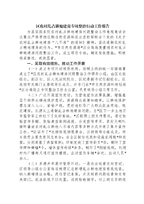 区农村乱占耕地建房专项整治行动工作报告为落实国务院农村乱占耕地建房问题整治工作电视电话会议要求严格贯彻近期自然资源部农业农村部联合下发的《关于农村乱占耕地建房八不准的通知》精神,坚决遏制农村乱占耕地建房的行为。*市自然资源局*区分局高度重视农村乱占耕地建房问题整治工作,成立领导专班,制定有效措施,积极稳妥推进,成效显著。一、采取有效措施,推动工作开展(一)成立专项行动领导机构。按照上级的统一安排部署成立了*区农村乱占耕地建房问题整治工作领导小组,由区长任组长,副区长、区人民法院院长、区纪委副书记任副组长,区政府有关部门主要领导任成员。并专门在*市自然资源和规划局*区分局设立专项整治工作办公室,负责领导小组日常工作。(二)广泛开展宣传发动。为营造宣传浓厚氛围,增强基层干部群众耕地保护意识,提高群众政策知晓率,让耕地保护理念深入人心、家喻户晓,更好地引导广大群众依法用地、规范建房,从源头上遏制乱占耕地建房问题,为*区下一步土地日常监管等工作打下了良好基础。*区按照上级文件要求,通过张贴宣传条幅、张贴典型案例海报、分发宣传单页、农村大喇叭循环播放农村乱占耕地八不准内容等多种方式开展了集中宣传工作。*区召开了*次拆除现场观摩会,区级领导小组成员,两乡政府主要负责同志参加;在全区按住宅类和设施农用地*种类型,分别通报了典型案例;印刷发放了宣传彩页*份,制作了宣传牌和横幅*个,墙体宣传标语