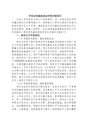 一季度党风廉政建设形势分析报告为深入贯彻落实全面从严治党要求,进一步做好党总支党风廉政建设和反腐倡廉工作,持续强化干部职工遵规守纪意识,营造风清气正工作环境,确保党总支党风廉政风险防控各项工作有效落实,根据上级要求,结合滨海湿地调查室党总支工作实际情况,现将党风廉政建设形势分析情况汇报如下:一、具体工作开展情况(一)开展学习教育,提高思想认识常态化的学习教育是党总支开展廉政风险防控工作的一项行之有效的重要工作,经常性查找廉政风险点是健全科室反腐倡廉长效机制的基础和前提。党总支始终把学习教育作为党风廉政建设的基础性工作,以学习教育为抓手,坚持常学常悟,持续增强思想认识,将学习教育贯穿于党风廉政建设工作的始终。组织党员干部认真学习十九大及十九届历次全会精神、学习XXXXXX的重要讲话精神、学习党章党规和上级下发的廉政、反腐倡廉方面的文件通知精神,观看关于反腐倡廉相关警示教育片,召开了党总支会议、2个党支部、5个临时党支部会议及警示教育讨论会等会议进一步巩固学习教育成果。通过日常的学习教育,让全体干部职工深刻认识到党风廉政工作的重要性,致力于将学习教育成效固化到夯实思想基础、改进工作作风、推动工作落实上来。(二)层层压实责任,强化责任落实党总支始终以落实责任制为根本,层层压实责任,严肃履行党风廉政建设工作责任制。党风廉政工作不仅仅是党总支书记和纪检委员的责任,每名党员都有责任和义务完成好