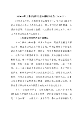 局2024年上半年意识形态分析研判报告(2130字)2024年上半年,局在市委的正确领导下,坚持以XXX新时代中国特色社会主义思想为指导,深入贯彻党的XXX精神,加强舆论引导,积极宣传正能量,扎实做好意识形态工作。现将上半年意识形态工作汇报如下。一、上半年意识形态总体开展情况(一)强化组织领导,压实工作责任。局高度重视意识形态工作,建立意识形态工作领导小组,明确各级领导干部在意识形态工作中的具体职责,确保每一项任务都能落实到具体的人。领导干部们要勇挑重担,靠前指挥,充分发挥带头作用,积极谋划、精心部署意识形态工作的各项举措。通过层层压实责任,形成一级抓一级、层层抓落实的工作格局,让每一个部门、每一个岗位都成为意识形态工作的坚强堡垒。成立了网评员队伍,积极配合市委网信办开展相关公众。我局思想上高度重视,行动上坚决有力,切实把意识形态工作抓紧抓实,为事业发展营造良好的思想舆论环境,凝聚起强大的精神力量,确保在意识形态领域始终保持正确的方向和坚定的立场。(二)强化理论学习,深化思想认识。以深入学习贯彻XXX新时代中国特色社会主义思想、党纪学习教育为主线,通过三会一课、主题党日、集中学习、个人自学等多种形式,组织党员干部认真学习党的理论方针政策,不断提高党员干部的政治理论水平和思想认识。一是以学习强国APP、河南干部网络学院为抓手,扎实推进学习强国平台的管理、学习工作,对学习不