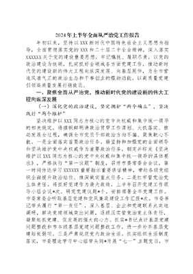 2024年上半年全面从严治党工作报告年初以来,坚持以XXX新时代中国特色社会主义思想为指导,全面贯彻落实党的XXX和二十届二中全会精神,深入落实XXXXXX关于党的建设重要思想,牢记嘱托、履职尽责,以党的政治建设为统领,扎实抓好全领域各方面党建工作,推动新时代党的建设新的伟大工程向纵深发展、向基层延伸,为全市营造风清气正的政治生态和干事创业的强劲动能,以高质量党建引领高质量发展行稳致远。一、聚焦全面从严治党,推动新时代党的建设新的伟大工程向纵深发展(一)深化党的政治建设,坚定拥护两个确立,坚决践行两个维护坚决维护以XXX同志为核心的党中央权威和集中统一领导的相关规定,将旗帜鲜明讲政治贯穿工作谋划、大抓落实、推动发展全过程,确保全市党员干部政治方向不偏、聚焦靶心不散。一是全面落实首要政治任务。将坚持和加强党的全面领导和坚决维护党中央权威作为首要政治任务,制定并印发《坚决维护以XXX同志为核心的党中央权威和集中统一领导的具体要求》,严格执行第一议题制度,召开市委常委会会议,第一时间传达学习XXXXXX重要指示重要讲话精神,带动各级党组织全面提升政治站位、推深做实重点任务。二是扛牢管党治党主体责任。将抓好党建作为最大政绩,上半年召开党建工作领导小组会议*次,研究党建议题*个,安排部署全年党建工作。市委常委会听取基层党建和党风廉政建设工作汇报*次。市委书记带头履行第一责任,