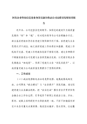 国有企业坚持以党建业务深度融合推动公司高质量发展情况报告近年来,公司把坚持党的领导、加强党的建设作为高质量发展的根和魂,针对党的领导与公司治理融合不足、部分基层党组织仍存在党建引领保障作用不强、抓党建与业务思想认识不到位、缺乏抓好党建工作的责任和激情、党建工作机制不完善、党建工作的载体创新不够等问题,通过多种路径不断探索推进公司党建与业务深度融合发展,以党建引领业务发展跑出加速度,实现了党建与业务双促双提升,以高质量党建为公司高质量发展提供了坚强的保障。一、工作成效(一)政治优势转化为公司竞争优势、发展优势成效突出。公司聚焦政治建设与业务提升双促双融,通过创建党建与业务融合机制,把政治忠诚摆在首位并贯穿国有金融企业工作全过程,引导党员干部职工在政治立场、方向、原则、道路上始终同党中央保持高度一致,不折不扣地落实好党中央各项重大决策部署,做到坚决维护、坚决贯彻。打造服务型党组织,勇担社会责任,纾解企业痛点,不断优化供给端的金融资源配置,加强银企对接,降低融资成本,满足企业的多样化金融需求。与当地经济发展同频共振、同向发力,让金融惠企政策最快落实到企业口袋里,进一步激发市场主体活力,帮助企业破解难题、渡过难关,全力支持实体经济高质量发展。通过强化党的创新理论武装,进一步夯实职工理论基础、激发干部队伍生机活力、弘扬担当实干作风,公司紧紧围绕十四五发展规划,