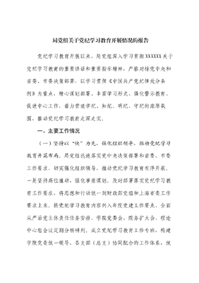 局党组关于党纪学习教育开展情况的报告党纪学习教育开展以来,局党组深入学习贯彻XXXXXX关于党纪学习教育的重要讲话和重要指示精神,严格对标党中央和省委、市委决策部署,以学习贯彻《中国共产党纪律处分条例》为重点,精心谋划部署、丰富学习形式、强化警示教育、促进中心工作,着力营造学纪、知纪、明纪、守纪的浓厚氛围,推动党纪学习教育走深走实。一、主要工作情况(一)坚持以快为先,强化组织领导,推动党纪学习教育开篇布局。局党组迅速落实党中央决策部署和省委、市委工作要求,切实强化组织领导,推动党纪学习教育有序开展。一是坚持高位推动,强化事前谋划。及时部署落实党纪学习教育工作要求,将思想和行动统一到财政部党组和上海市委工作要求上来。将党纪学习教育内容列入年度党建工作要点、全面从严治党主体责任任务安排,学院党委会、院务扩大会、理论中心组会议定期分析研判。成立党纪学习教育工作专班,构建学院党委统一领导、各支部(总支)协同配合的工作体系,统筹推动党纪学习教育走深走实。二是完善工作机制,夯实工作基础。发布《上海国家会计学院开展党纪学习教育实施方案》,落实党纪学习教育工作责任制,明确责任人、牵头部门与责任部门,细化学习目标、工作安排与要求。发放《XXX关于全面加强党的纪律建设论述摘编》、《中国共产党纪律处分条例》(以下简称《条例》)等学习材料,建立学习提示机制,推动党员干部齐学共进。在学院官网开设党纪学