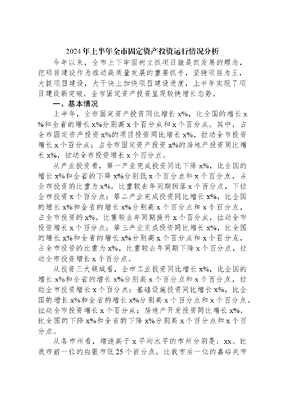 2024年上半年全市固定资产投资运行情况分析今年以来,全市上下牢固树立抓项目就是抓发展的理念,把项目建设作为推动高质量发展的重要抓手,坚持项目为王,大抓项目建设,大干快上加快项目建设进度,上半年实现了项目建设新突破,全市固定资产投资呈现较快增长态势。一、基本情况上半年,全市固定资产投资同比增长x%,比全国的增长x%和全省的增长x%分别高x个百分点和x个百分点。其中,占全市固定资产投资x%的项目投资同比增长x%,拉动全市投资增长x个百分点;占全市固定资产投资x%的房地产投资同比增长x%,拉动全市投资增长x个百分点。从产业投资看,第一产业完成投资同比下降x%,比全国的增长x%和全省的下降x%分别低x个百分点和x个百分点,占全市投资的比重为x%,比重较去年同期回落x个百分点,下拉全市投资x个百分点;第二产业完成投资同比增长x%,比全国的增长x%和全省的增长x%分别高x个百分点和x个百分点,占全市投资的x%,比重较去年同期提升x个百分点,拉动全市投资增长x个百分点;第三产业完成投资同比增长x%,比全国的增长x%和全省的增长x%分别高x个百分点和x个百分点,占全市投资的比重为x%,比重较去年同期下降x个百分点,拉动全市投资增长x个百分点。从投资三大领域看,全市工业投资同比增长x%,比全国的增长x%和全省的增长x%分别高x个百分点和x个百分点,拉动全市投资增长x个百分点;基础设施投资同比增长x