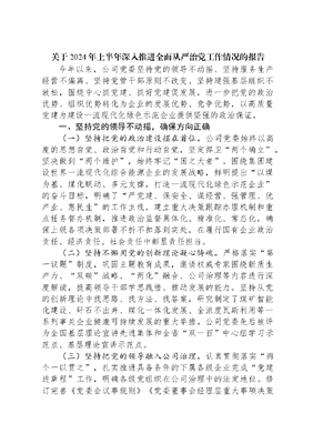 关于2024年上半年深入推进全面从严治党工作情况的报告今年以来,公司党委坚持党的领导不动摇、坚持服务生产经营不偏离、坚持党管干部原则不改变、坚持建强基层组织不放松,围绕中心抓党建、抓好党建促发展,进一步把党的政治优势、组织优势转化为企业的发展优势、竞争优势,以高质量党建为建设一流现代化绿色示范企业提供坚强的政治保证。一、坚持党的领导不动摇,确保方向正确(一)坚持把党的政治建设摆在首位。公司党委始终以高度的思想自觉、政治自觉和行动自觉,坚定捍卫两个确立,坚决做到两个维护,始终牢记国之大者。围绕集团建设世界一流现代化综合能源企业的发展战略,鲜明提出以煤为基、煤化联动、多元支撑,打造一流现代化绿色示范企业的奋斗目标,明确了严党建、保安全、谋经营、强管理、优产业、惠民生的工作主线,建立重大决策跟踪办理机制和重点任务督办机制,推进政治监督具体化、精准化、常态化,确保上级各项决策部署不折不扣落到实处,在履行国有企业政治责任、经济责任、社会责任中彰显责任担当。(二)坚持不懈用党的创新理论凝心铸魂。严格落实第一议题制度,巩固主题教育成果,邀请权威专家围绕新质生产力、双碳战略、两化融合、公司治理等内容进行深度解读,提高领导干部学思践悟、推动发展的能力。坚持从党的创新理论中找思路、找方法、找答案,研究制定了煤矿智能化建设、矸石不出井、煤化一体化发展、全浓度瓦斯利用等一系