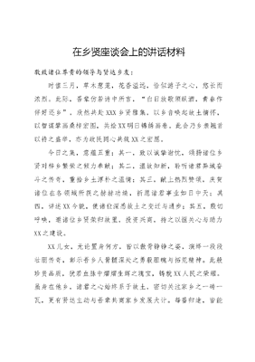 在乡贤座谈会上的讲话材料敬致诸位尊贵的领导与贤达乡友:时值三月,草木葱茏,花香溢远,恰似游子之心,悠长而浓烈。此际,吾辈仿若诗中所言,白日放歌须纵酒,青春作伴好还乡,欣然共赴XXX乡贤雅集,以乡音唤起故土情怀,以智谋擘画桑梓宏图,共绘XX明日锦绣画卷。此会乃乡亲翘首以待之盛举,亦为政民同心共筑XX之宏愿。今日之集,意蕴五重:其一,致以诚挚谢忱,颂扬诸位乡贤对梓乡繁荣之倾力奉献;其二,温故知新,聆听诸君异域奋斗之传奇,重拾乡土淳朴之温情;其三,献上热烈赞颂,庆贺诸位在各领域所获之赫赫功绩,祈愿诸君事业如日中天;其四,详述XX今貌,使诸位深悉故土之变迁与进步;其五,殷切呼唤,邀诸位乡贤荣归故里,投资兴商,持之以恒关心与助力XX之建设。XX儿女,无论置身何方,皆以傲骨铮铮之姿,演绎一段段壮丽传奇,彰示吾乡人骨髓深处之勇毅胆魄与拓荒精神。此般珍贵品质,犹若血脉中熠熠生辉之瑰宝,铸就XX人民之荣耀。虽身在他乡,诸君之心始终系于故土,密切关注家乡之一砖一瓦,更有贤达主动与吾辈共商家乡发展大计。每番归途,皆能目睹XX之茁壮成长与辉煌成就。近年来,XXXXX秉持修德固基、兴产强镇、筑基惠民、育美护生之执政理念,上下一心,奋发有为,构筑全镇同舟共济、共谋发展的大同舟,营造出百舸争流、奋发向前的大画卷。在各级领导之关怀下,于诸位乡贤之襄助中,于全镇民众之合力下,XXX荣获湖南省脱贫攻坚先进集体、应急能力建设先进单位等诸多省、市、县级殊荣,成绩斐然,引人瞩目。现下,吾欲以三幅生动画卷,向诸位展现XX之今日风采:一、人才荟萃之XX——才俊辈出,群英璀璨青云直上凌霄汉,我辈岂为池中物。XXXXX始终矢志于锻造一支案牍劳形能挥毫,讲坛之上能激昂,江湖之中能驰骋的精英干部队伍。吾辈优化育才沃土,深化育才机制,育成一支胸怀壮志、才智过人、勇于担当之干部队伍。此辈英杰年富力强,学识渊博,经验丰富,具备卓绝之执行力与创新力,犹如XX之栋梁,无论风雨如何变幻,皆能挺身而出,力挽狂澜,成为驱动XX发展之关键引擎。二、物华天宝之XX——地利人和,经济繁盛辟地开疆展英姿,探骊得珠创伟绩。XXX巧妙利用得天独厚之地缘优势、丰饶之自然资源与人文底蕴,精巧布局,文可居文库——海量学习资料,手机电脑均可下载www.wenkeju.com精准施力,构建起创业兴商、经济发展之坚实堡垒。吾辈紧握交通便利、资源丰富之天赐良机,大力培植特色产业,成功引入华中钰锔储煤基地、愿景创博微米粉体新材料等重大项目,为XX注入磅礴发展动力。传统产业革新转型成效卓著,粮食、烤烟、油茶等产业繁花似锦,百姓收入稳步攀升,幸福感、安全感、满足感如潮涌动。三、和谐秀美之XX——民心所向,共筑理想千磨万击仍坚劲,任凭风雨肆东西。面对汹涌澎湃之时代浪潮,XXXXX始终昂扬斗志,引领全镇民众,披荆斩棘,矢志构建亲商、爱商、敬商之营商环境,推动乡村振兴,增进民生福祉。吾辈坚守以人为本,和谐至上,积极构筑和谐融洽之党群关系,塑造团结协作、共谋发展之良好氛围。在全体党员干部之齐心协力下,XXX人居环境焕然一新,营商环境日臻完善,生态环境得到有效呵护,展现出一幅和谐、秀美、宜人之新画卷。尊贵的乡贤们,XX这片热土正洋溢着无尽生机与活力,期盼诸位常回故里,更企望诸位将智慧、财富、力量回馈故土,共铸XX璀璨未来。愿吾辈在共建社会主义现代化新XX之征途中,心手相连,砥砺前行,共书XX繁荣昌盛之华章!末了,衷心祝福诸位乡贤事业腾达、阖家欢乐、身心康文可居文库——海量学习资料,手机电脑均可下载www.wenkeju.com泰!谢谢大家!文可居文库——海量学习资料,手机电脑均可下载www.wenkeju.com