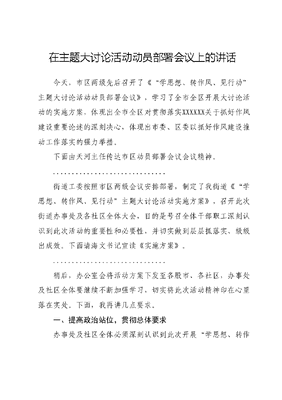在主题大讨论活动动员部署会议上的讲话今天,市区两级先后召开了《学思想、转作风、见行动主题大讨论活动动员部署会议》,学习了全市全区开展大讨论活动的实施方案,体现出全市全区对贯彻落实XXXXXX关于抓好作风建设重要论述的深刻决心,体现出市委、区委以抓好作风建设推动工作落实的强力举措。下面由天河主任传达市区动员部署会议会议精神。街道工委按照市区两级会议安排部署,制定了我街道《学思想、转作风、见行动主题大讨论活动实施方案》,召开此次街道办事处及各社区全体大会,目的是号召全体干部职工深刻认识到此次活动的重要性和必要性,并切实做到层层抓落实、级级出成效。下面请海文书记宣读《实施方案》。稍后,办公室会将活动方案下发至各股市、各社区,办事处及社区全体要继续不断加强学习,切实将此次活动精神印在心里落在实处。下面,我再讲几点要求。一、提高政治站位,贯彻总体要求办事处及社区全体必须深刻认识到此次开展学思想、转作风、见行动主题大讨论活动的重大意义,切实把市委、区委的思想指导、决策部署和行动安排落实到基层中来,切切实实贯彻思想大解放、推动能力大提升、实现作风大转变、做到工作大落实。二、明确目标任务,形成工作合力街道全体要围绕如何在增强纪律意识和规矩意识中践行初心使命、如何在严以用权反对特权思想和特权现象中永葆清正廉洁政治本色、如何在履职尽责和担当作为中彰显党员先锋模范作用开展大讨论,推动全体干部职工提高自我提高、自我革命的勇气和魄力,着力营造风清气正、干事创业的浓厚氛围,要认真贯彻市委、区委工作要求,明确目标任务,严格按照《实施方案》的工作安排,齐心合力确保主题大讨论活动取得应有效果。三、强化组织领导,确保扎实开展要切实把市区会议精神落实到街道层面,确保活动扎实开展街道工作专班要加强统筹推进综合协调,党工委要扛起主体责任精心组织谋划,切实推动实施;一把手要认真履行第一责任人责任,亲自研究谋划、部署推动,班子成员要落实一岗双责,各司其职、齐抓共管,合力推动活动开展。班子成员要对各股室、各社区活动开展情况进行指导、督促、检查,及时提文可居文库——海量学习资料,手机电脑均可下载www.wenkeju.com出整改意见、督办整改落实,确保活动有力有序开展。要通过门户网站、公众号等媒体渠道,广泛宣传报道纠治干部队伍作风顽疾的工作成效,同时加大对反面典型问题的通报曝光力度,切实发挥警示教育与震慑作用;积极宣传先进典型,形成比学赶超的良好氛围。要把大讨论同巩固主题教育成果和腐败专项整治、街道中心工作结合起来,严防两张皮,确保各项规定动作深入推进,切实把大讨论成果转化为推动各项工作高质量开展的实际成效。我就讲这么多,谢谢大家!文可居文库——海量学习资料,手机电脑均可下载www.wenkeju.com