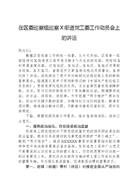 在区委巡察组巡察X街道党工委工作动员会上的讲话同志们:根据区委巡察工作的统一部署,从今天开始,区委第一巡察组将对X街道党工委开展为期3个月左右的巡察,同时对X村开展直接巡察,对X社区、X社区、X社区、X社区开展联合巡察。X月X日,省委召开了第X轮巡视动员部署会,X书记作了讲话,深刻阐述了党中央对新时代巡视巡察工作的新部署新要求,强调要认真学习贯彻新修订的《中国共产党巡视工作条例》,更好发挥巡视利剑作用,为全省高质量发展清障护航。会后,X书记对巡察组进行了集体廉政谈话,强调要讲政治、讲方法、讲质效、讲纪律,牢牢把握两个维护根本任务,突出对关键少数的监督、加强对权力运行的监督,精准发现问题、精准推动解决问题,不断磨光磨亮巡察利剑、提升巡察质效。下面,根据巡视巡察工作要求,结合X街道实际,我讲三点意见。一、提高政治站位,自觉接受政治监督巡察是上级党组织对下级党组织履行党的领导职能责任的政治监督,根本任务是推动被巡察党组织拥护两个确立、做到两个维护,推动XXXXXX重要讲话重要指示批示精神和党中央决策部署真正落实落细。X街道党工委和广大党员干部要深刻认识巡察工作的重大意义,切实把思想和行动统一到区委要求上来,要把这次巡察作为推动党工委工作深化发展的重要举措,作为强化基层监督、促进基层治理的重要抓手。第一,巡镇(街道)带村(社区)对推进全面从严治党向基层延伸具有重要意义。《党支部工作条例》明确,要推进监督向基层延伸。省纪委监委出台的《关于提升基层纪检监察机构监督能力推动监督向基层延伸的指导意见》也明确,开展村(社区)巡察是加强基层监督的重要措施。因此,把村(社区)纳入区委巡察监督不仅是有法律法规依据的,也是基层监督的重要组成部分,是推动党的监督向基层延伸的重要抓手。近年来,基层作风问题得到了很大改观,腐败问题也得到了很好的查处,但党的领导虚化弱化,蝇贪蚁腐、私分滥发、套取截留、虚报冒领等问题,在有的村(社区)仍然不同程度存在。因此,加强村(社区)巡察,目的就是要盯住这些问题,盯住班子成员和关键少数,推动基层把这些问题全部解决掉。第二,巡镇(街道)带村(社区)对增强群众幸福感获得感安全感具有重要意义。基础不牢,地动山摇。我们共产党执政最基本的是基层人民群众,把最基层的问题解决了,党的执政基础就更加厚实了。XXXXXX指出,要牢固树立大抓基层的鲜明导向,推动市县巡察向基层延伸。巡镇(街道)带村(社区)就是听民意疏民怨解民困,通过巡察听取群众意见、解决群众问题、疏通群众情绪。我们要通过巡察真实听取民意,听取老百姓的诉求,推动问题的解决,让老百姓感受到巡察带来的变化。第三,巡镇(街道)带村(社区)对推进基层治理现代化具有重要意义。巡察是党内监督的利剑,是党实现自我革命的重要方式和锐利武器。对镇(街道)、村(社区)的巡察是推动新一届区委巡察工作深化发展的重要举措,是强化基层监督、促进基层治理的重要抓手。要通过加强村(社区)巡察,提高村民、社民自治和自我管理水平,从而加速推进基层治理的现代化。X街道党工委要结合贯彻中央《关于加强基层治理体系和治理能力现代化建设的意见》,把巡察作为重要契机,切实加强基层治理。二、突出问题导向,准确把握监督重点文可居文库——海量学习资料,手机电脑均可下载www.wenkeju.com根据巡视发现问题、形成震慑、推动改革、促进发展的工作方针和区委要求,区委巡察组对照党中央关于立足新发展阶段、贯彻新发展理念、构建新发展格局、推动高质量发展等重大决策部署和省委、市委、区委工作要求,将始终突出问题导向,紧盯单位职能责任,紧盯全面从严治党阶段性主要矛盾,紧盯领导班子和关键少数,紧盯人民群众反映强烈的突出问题,从严从实加强监督检查。对于街道党工委:将紧扣四个聚焦,主要是聚焦党的理论路线方针政策和党中央重大决策部署以及省委、市委、区委工作要求,在基层贯彻落实情况;聚焦群众身边腐败问题和不正之风以及群众反映强烈的问题,推动全面从严治党向基层延伸;聚焦基层党组织领导班子和干部队伍建设,推动解决软弱涣散问题、增强基层治理实效等问题;聚焦巡视巡察、审计等监督发现问题和主题教育等检视问题整改落实情况,推动解决整改责任压实不力、集中整改期后涛声依旧等问题。对于村(社区)党组织:主要是聚焦基层贯彻落实党的理论路线方针政策和党中央重大决策部署以及省委、市委、区委工作要求情况;紧盯群众身边作风、腐败问题以及村(社区)三资管理、民生领域和群众关心的突出问题,重点了解村(社区)党组织落实党建主体责任、发挥政治功能情况、基层组织生活开展情况、基层党组织换届选举情况等。三、强化责任担当,共同完成好巡察任务区委决定对X街道党工委开展巡察,既是对X街道各级党组织和党员干部的关心爱护,也是区委交给区委第一巡察组和