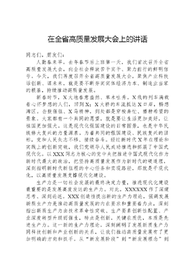 在全省高质量发展大会上的讲话同志们,朋友们:人勤春来早。去年春节后上班第一天,我们首次召开全省高质量发展大会,向全社会释放苦干实干、聚力前行的鲜明信号。今天,我们再度召开全省高质量发展大会,聚焦产业科技话创新、谋未来,就是要不断夯实实体经济为本、制造业当家的根基,持续推动高质量发展。新春时节,X大地春意盎然、草木吐秀。X线的列车满载着心怀梦想的人们,回到X;X大桥的车流抵达X口岸,畅想湾区。击鼓催征、X马精神,到处都是穿梭奔忙、播种希望的景象。大家都有一个共同的愿望,就是要让生活更加美好,让祖国更加强大。这是现代化强国建设的日常图景,也是中华民族伟大复兴的力量源泉。为着共同的强国建设、民族复兴的目标,党和人民矢志不移、接续奋斗。经过新时代X年在理论和实践上的创新突破,我们党领导人民成功推进和拓展了中国式现代化。以XXX同志为核心的党中央把推进中国式现代化作为新时代最大的政治,把坚持高质量发展作为新时代的硬道理,深刻指明新时代新征程的中心任务和实现路径,那就是干现代化,以高质量发展支撑现代化建设。生产力是一切社会发展的最终决定力量,推进现代化建设最重要的是发展高度发达的生产力。对此,XXXXXX作了深邃思考、深刻论述。XXX创造性提出新的生产力理论,强调发展新质生产力是推动高质量发展的内在要求和重要着力点,深刻指出新质生产力由技术革命性突破、生产要素创新性配置、产业深度转型升级而催生,特点是创新,关键在质优,本质是先进生产力。这一新的生产力理论,深刻阐明了发展新质生产力同科技创新和产业创新的关系,让我们推动高质量发展有了更加明确的方向和抓手。从新发展阶段到新发展理念到新发展格局再到新质生产力,XXX就经济发展提出一系列新理念新思想新战略,作出一系列重大决策部署,谱写了XXX经济思想的新篇章,推动高质量发展成为全党全社会的共识和自觉行动,成为经济发展的主旋律。X作为经济大省、制造业大省,拥有丰厚的科技创新资源和雄厚的科技创新实力,在高质量发展上肩负重要使命和重大责任。党的十八大以来,XXXXXX5次亲临X,对我们推动高质量发展、做大做强实体经济、以科技创新推动产业创新谆谆指引。XXX强调,X要做创新驱动排头兵;XXX要求,X要着力打造具有全球影响力的产业科技创新中心。在XXX亲切关怀下,X区国际科技创新中心、综合性国家科学中心、高水平人才高地等全面建设,鹏城实验室、X实验室、大科学装置等国之重器相继布局,国家技术创新中心、制造业创新中心、产业创新中心等密集落地,高水平大学、科研院所、科技领军企业等积厚成势。X具备了坚实的产业科技创新基础和创新优势,区域创新综合能力连续X年全国第一,全省上下形成强烈共识:高质量发展是X实现现代化的根本出路,高质量发展本质上是创新驱动发展。我们要坚定不移走好高质量发展之路,抓住科技创新这个牛鼻子,把创新落到企业上、产业上、发展上,奋力建设一个靠创新进、靠创新强、靠创新胜的现代化的新X。观大局,中国式现代化徐徐展开,夯实物质技术基础责重如山。接过历史的接力棒,建设一个现代化的新X,XXXXXX、党中央寄予厚望,父老乡亲充满期待,我们这代人要有再创奇迹、再写辉煌的志气和担当,才能不辜负先辈,对得起后人。从现在起到2035年基本实现现代化时间紧、任务重,X要走在前列,要求很高、难度很大。对照中国式现代化的5个中国特色,无论是让全省全域、全省人民整体迈入现代化、促进共同富裕,还是推动两个文明相协调、人与自然相和谐,都需要有强大的物质技术基础作支撑。对照两步走战略安排特别是第一步的总体目标,我们要率先达到中等发达经济体水平、率先进入创新型经济体前列,还有较大差距和不足,也意味着有较大的潜力和空间。实现这些目标任务,达到新的发展高度,关键要靠科技创新、靠产业发展,不断解放和发展生产力,不断创造和积累社会财富。抓机遇,科技浪潮滚滚而来,拥抱新的科学的春天时不我待。现在,世界新一轮科技革命和产业变革深入发展,同我国转向创新驱动、走向高质量发展历史性交汇,新的科学的春天已经扑面而来。这是一场波澜壮阔的革命与变革,也是一场抢占战略制高点的比拼。抓住了机遇,我们就能实现换道超车、后发崛起;错失了机遇,我们的差距可能被进一步拉大,又将在不利的位势徘徊。这一次,我们有机会也一定要挺立在科技浪潮的潮头。纵观工业革命史,每一次科技革命和产业变革都是从点上突破、局部爆发开始的,英国曼彻斯特、德国鲁尔、美国硅谷,都扮演了创新策源地的重要角色。在这一轮科技革命和产业变革中,X要担当起该担当的责任,紧盯颠覆性、前沿性技术,抓牢战略性、先导性产业,努力成为主要的创新策源地,赢得战略必争领域的胜利。行大道,新质生产力欣欣向荣,实现产业科技互促双强前景无限。新质生产力,新在新的科学技术、新的生产方式、