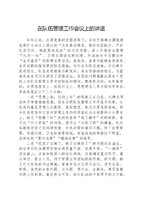 在队伍管理工作会议上的讲话今年以来,在局党委的坚强领导下,全体干部群众围绕局党委扩大会议上提出的大抓基层建设、狠抓攻坚能力、严抓队伍作风、特抓落地见效的工作思路,深入开展安全管理九无一创、正规化建设达标创建、作战安全专项整治和金头盔班创新建设等活动,各战线、各单位能够各负其责、各司其职的强化管控防范措施,对外全力防范疫情,对内倾力促进稳定,队伍发展根基不断筑牢,安全形势持续稳定,为圆满完成各项任务提供了坚强保证。发现的问题暴露出局各个层级上在队伍管理工作中的短板和弱项,既有机关的,也有基层的,在贯彻落实上、抓执行力上、思想理念上等方面均有存在。具体表现在以下三个方面:一是思想上热,行动上冷的现象正在凸显。从蹲点帮扶和日常掌握情况看,局各层级队伍管理工作开展不均衡,从机关到基层思想认识高度、重视程度、执行力度逐级递减。部分队伍党委和主官对管理工作仍然停留在会议部署和口头要求上,缺乏拖鞋下田式的检查和庖丁解牛式的剖析,拿不出行之有效的对策,提不出对症下药的措施。机关各战线处室之间沟通衔接、齐抓共管的意识不强,除了日常管理、作战训练、卫生防疫等领域,其他战线的举措还不明显,没有达到聚沙成塔握指成拳的效果。二是把说了当做了,做了当做好了的问题还在滋生。部分单位队伍管理形势分析质量不高、效果不好,一锅煮浮在面上,没有细致深入的划分领域,没有确定重点环节、重点单位、重点人员,对于管理工作面临的新形势、新问题,缺乏行之有效的方法措施,普遍存在以记录代会议,没有全面、客观、真实的去查问题、议问题、想办法、去解决,甚至直接问题上交到局,毫无担当可言。部分队站的干部骨干能力欠缺、经验匮乏,在抓队伍、抓管理上形式单一、内容简单,有时应付差事、敷衍了事。三是心存侥幸、铤而走险的邪念仍在作祟。在局三令五申、高压严管的态势下,个别单位、个别人员仍旧游走在制度边缘。疫情管控期间,个别人员出省、出市不报备,有的擅自前往中、高风险地区,返回后被地方防疫部门流调隔离;在特殊安保期间,个别人员在网上发表敏感言论,被公安机关查获;有的人缺乏正确的恋爱观,轻易与地方女青年发生关系,被网络舆情举报,造成了不良的社会导向,有损队伍形象;有的人经常浏览不健康网站,丧失自控底线,与地方女青年发生有金钱来往的男女关系,甚至主动诱导他人与其共同失足堕落;还有部分人饮酒不报备、值班不值守、随警不出动。针对以上问题,个别单位对问题苗头重视不够、不以为然、见怪不怪,才导致问题最终的发生,给组织和违纪人员带来了不可挽回的影响。目前,确保队伍高度安全稳定的任务尤为艰巨、尤为重要尤为紧迫。队伍安全稳定是队伍发展的根基,是队伍的保底工程,局各级要自觉提高政治站位,牢固树立底线思维,不断增强抓好队伍管理和安全工作的紧迫感、危机感和责任感,切实把队伍管理工作稳在思想认识上,稳在日常检查上,稳在防风险、防隐患、抓薄弱环节上,严格执行铁规禁令,坚决守住安全底线、不越纪律红线、不碰法律高压线。下面,我代表局党委强调三点意见:一、提高认识,强化责任,找出队伍管理中防范化解风险的源头。现在,我们很多干部群众看不到、看不全、看不透风险,这才是最大的风险。一是党委主体责任落实不到位,这是风险存在的源头。有的队伍基层党委长期不议管议教,队伍管理教育形势分析轻描淡写;有的队伍主官没有牢固树立安全发展理念,导致问题一而再、再而三发生。有的对抓队伍缺乏应有的认识高度,嘴里喊的是两手抓、两手都要硬,实际变成了抓一手、软一手。有的队伍主官对已经发生的事故案件,认识不到位、教训不吸取,总是强调意外,没有从根源上找原因、论危害。有的队伍主官对本单位管理教育情况若明若暗、胸中无数。有的虽然建立了队伍领导包片联系点制度,开展了基层安全万里行,但很少下基层指导帮建,即使去了,也是走马观花、打卡刷存在感,三个三录入弄虚作假。这些说明,队伍建设在个别队伍党委工作中的位置还摆得不够高,在一些队伍主官心中的分量还不够重。二是经常性工作抓得不扎实,这是风险存在的原因。XXXXXX指出干事业不能做样子,必须脚踏实地。事故案件屡禁不止,究其原因,都存在管理不严格、教育走形式、执行不彻底等问题。有的单位按纲建队、按规抓建意识不强,管理粗放,执行条令随意性大,搞变通、打折扣,部分干部群众条令条例意识淡薄,遵章守纪意识差,能力素质不适应要求,机关灯下黑和队伍宽松软、慵懒散的问题十分突出。有的单位教育开展不扎实,干部群众法纪观念淡薄,安全意识不高,心态不平衡,管理上向地方靠拢,待遇上与部队比较,满腹牢骚、怪话连篇。有的单位平常忽视抓管理、弱化抓教育,用的精力不够,管理制度落实不力,管理不讲方法、不讲感情、简单粗暴,八小时外、营区外失控漏管。三是基层党组
