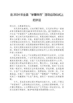 在2024年全县学雷锋月活动启动仪式上的讲话同志们、志愿者朋友们:东风劲吹春潮涌,大地回暖万物苏。在毛泽东等老一辈革命家为雷锋同志题词61周年即将到来之际,我们隆重集会,举行全县学雷锋月主题实践活动启动仪式,这既是传承雷锋精神、树立时代新风的具体行动,更是创建文明城市、凝聚发展合力的重大举措。在此,我谨代表县文明委,向全县积极参与学雷锋活动的同志们、积极投身志愿公益事业的志愿者朋友表示亲切的问候!向获得表彰的学雷锋示范点、岗位学雷锋标兵,优秀志愿服务组织及志愿者们表示热烈的祝贺!向关心支持、积极参与学雷锋志愿服务活动的各界人士表示崇高的敬意和衷心的感谢!近年来,全县上下以创建全国文明城市为主抓手,大力传承和弘扬雷锋精神,广泛开展志愿活动,志愿服务事业呈现出蓬勃发展的喜人局面。全县广大志愿者在服务县委中心工作、创建全国文明城市等重点工作中,勠力同心、无私奉献,真正做到了为政府分忧、为百姓解困、为文明树旗,得到了社会各界的一致好评。特别是在去年复杂疫情、罕见旱情、各类险情中,全县广大志愿者挺身而出、英勇奋战,冲在第一线、干在最前沿,打赢了一场场阻击战围剿战清零战,构筑起了一道靓丽的红色防线,谱写了一曲曲动人的奉献赞歌。今年,是我县创建全国文明城市决胜之年。全县上下要以学雷锋月主题实践活动为契机,主动践行雷锋精神,广泛开展志愿服务,让志愿服务成为广大市民的一种自觉行动,切实为创建文明城市、推进*高质量发展凝聚强大合力。我们要做大宣传,推动学雷锋志愿精神焕发生机。要以纪念毛泽东等老一辈革命家为雷锋同志题词60周年为契机,创新宣传载体,丰富宣传形式,利用微信、网络、新闻媒体、公益广告、知识讲座、发放宣传册等多种形式,开展专题纪念活动,全面阐释雷锋精神时代内涵,引导激励更多党员、干部、群众把学雷锋志愿服务活动融入日常、化作经常,让雷锋精神在新时代绽放更加璀璨的光芒。我们要做活载体,推动学雷锋志愿活动常态长效。各级志愿服务组织和广大志愿者要聚焦为党分忧解愁、为人民群众办事解难这个根本任务,不断拓宽服务领域,提升服务效能,推进文明创建、扶老救孤、恤病助残等领域志愿服务走深走实。各类志愿服务组织要发挥优势、各展所长,打造项目精品,形成品牌效应,促进全县志愿服务在空间上向大街小巷延伸、在内容上向大事小情拓展,让温情爱心洒遍京海每个角落。我们要做优机制,推动学雷锋志愿队伍持续壮大。要整合联系各类资源,通过集中培训、赛事选拔等多种途径,持续壮大志愿者队伍,切实提高志愿者覆盖率和活跃度,逐步建成一支数量充足、素质优良、结构合理、服务专业、富有特色的志愿者队伍。要高度重视志愿者队伍建设,全面推行志愿服务记录制度,建立健全志愿者礼遇优待机制,加快营造人人争做志愿者,人人崇尚志愿者的社会氛围,让志愿红成为城市最亮丽的风景线。同志们,信仰之光永不磨灭,雷锋精神代代相传。让我们向志愿者致敬,与雷锋精神同行,把学雷锋志愿服务作为每个人的生活方式、生活习惯,让志愿者成为我们大家共同的名字,让雷锋精神在*绽放更加璀璨的光芒,为加快推进我县高质量跨越式发展作出新的更大贡献!下面,我宣布:纪念毛泽东等老一辈革命家为雷锋同志题词61周年暨学雷锋月主题实践活动启动!