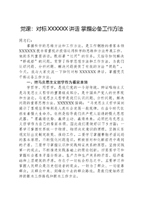 党课:对标XXXXXX讲话 掌握必备工作方法同志们:掌握科学的思维方法和工作方法,是工作制胜的看家本领XXXXXX就非常重视并提倡运用科学的思维和方法开展工作。他的系列重要讲话,既部署过河的任务,又指导如何解决桥或船的问题,贯穿了科学思想方法和工作方法,为我们认识问题、分析问题、解决问题提供了有效的方法钥匙。今天,我与大家交流一下如何对标XXXXXX讲话,掌握党员干部必备工作方法。一、把马克思主义哲学作为看家本领学哲学、用哲学,是我们党的一个好传统。辩证唯物主义是马克思主义哲学的重要组成部分,是中国共产党人的世界观和方法论。马克思主义哲学是我们认识问题、分析问题、解决问题的重要思想方法。XXXXXX强调:马克思主义哲学深刻揭示了客观世界特别是人类社会发展一般规律,在当今时代依然有着强大生命力,依然是指导我们共产党人前进的强大思想武器。要赢得优势、赢得主动、赢得未来,必须把马克思主义哲学作为自己的看家本领。因此我们要做好以下5方面:一要学习掌握世界统一于物质、物质决定意识的原理,坚持从客观实际出发制定政策、推动工作。二要学习掌握事物矛盾运动的基本原理,不断强化问题意识,积极面对和化解前进中遇到的矛盾。三要学习掌握认识和实践辩证关系的原理,坚持实践第一的观点,不断推进实践基础上的理论创新。四要要学习和掌握社会基本矛盾分析法。生产力和生产关系的矛盾、经济基础和上层建筑的矛盾,存在于一切社会形态之中。五要学习和掌握人民群众是历史创造者的观点。一切为了群众、一切依靠群众,从群众中来、到群众中去的群众路线,是我们党始终坚持的根本工作路线和根本工作方法。二、坚持实事求是坚持什么样的思想路线,就是坚持什么样的哲学。自建党初期,我们党就确立了实事求是思想路线在全党的指导地位。通过对马克思主义中国化历史进程、中国共产党成立103年来的历史进程以及改革开放40多年的历史进程的回顾和总结,联系党和国家正在做的事情,可以看出,坚持实事求是,我们的道路就越走越宽广,事业就越来越红火;背离实事求是,困难和挫折就会接踵而至。XXXXXX强调:实事求是,是马克思主义的根本观点,是中国共产党人认识世界、改造世界的根本要求,是党的基本思想方法、工作方法、领导方法。实践反复证明,坚持实事求是,就能兴党兴国;违背实事求是,就会误党误国。对此,我们要坚持实事求是,基础在于搞清楚实事,就是了解实际、掌握实情;关键在于求是,就是探求和掌握事物发展的规律。三、提高科学思维能力思路决定出路,思维水平决定工作水平。能不能正确判断形势、有效化解矛盾、顺利推进工作,关键是看党员干部有没有科学的思维能力和方法。广大党员干部应认真学习贯彻XXX新时代中国特色社会主义思想,在工作中善于抓主线、抓本质、抓亮点,提高个人思维能力,做一名合格的党员领导干部XXXXXX强调:我们党面对着十分复杂的国内外环境,肩负着繁重的执政使命,如果缺乏科学理论思维的有力支撑,是难以战胜各种风险和困难的,也是难以不断前进的。我们要重点提高以下集中能力:一是战略思维能力,就是高瞻远瞩、统揽全局,善于把握事物发展总体趋势和方向的能力。二是历史思维能力,就是以史为鉴、知古鉴今,善于运用历史眼光认识发展规律、把握前进方向、指导现实工作的能力。三是辩证思维能力,就是承认矛盾、分析矛盾、解决矛盾,善于抓住关键、找准重点、洞察事物发展规律的能力。四是创新思维能力,就是破除迷信、超越陈规,善于因时制宜、知难而进、开拓创新的能力。五是法治思维能力,就是增强尊法学法守法用法意识,善于运用法治方式治国理政的能力。六是底线思维能力,就是客观地设定最低目标,立足最低点,争取最大期望值的能力。四、要保持战略定力党的十八大以来,XXXXXX曾多次在重要会议或实地调研时,高频率反复强调战略定力。在具体的工作推进过程中,XXXXXX还对如何保持战略定力作了许多形象化表述,比如打铁必须自身硬要有钉钉子精神一张蓝图绘到底踏石留印、抓铁有痕等。可以说,保持战略定力是唯物辩证法的创造性应用,是我们党对马克思主义哲学方法论的又一重要贡献。XXXXXX说:我相信,只要我们保持战略定力,全面深化改革开放,深化供给侧结构性改革,下大气力解决存在的突出矛盾和问题,中国经济就一定能加快转入高质量发展轨道,中国人民就一定能战胜前进道路上的一切困难挑战,中国就一定能迎来更加光明的发展前景。对此我们要保持战略定力,要毫不动摇坚持和发展中国特色社会主义。要坚持稳中求进总基调,冷静观察,谨慎从事、谋定后动。要集中精力做好自己的事,坚定不移走和平发展道路。五、要坚持问题导向问题是时代的声音,每个时代总有属于它自己的问题,只有树立强烈的问题意识,才能实事求是地对待问题,才能找到引领时代进步的路标。增强问题意识符合马克思主义认