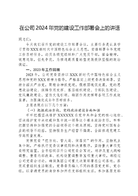 在公司2024年党的建设工作部署会上的讲话同志们:今天我们召开党的建设工作部署会议,主要任务是认真学习贯彻XXX新时代中国特色社会主义思想,安排部署今年党建工作目标任务,动员各级党组织和广大党员干部,振奋精神,锐意进取,创先争优,为推进高质量转型发展提供坚强的政治保证。一、2023年工作回顾2023年,公司党委坚持以XXX新时代中国特色社会主义思想和党的XXX精神为指导,严格落实上级党委决策部署,坚持全面从严治党,聚精会神抓党建,强根固魂促发展,党的思想政治建设、保障作用发挥、基层组织建设、干部队伍建设、党风廉政建设、宣传文化引领、群团作用发挥等各项工作成效显著,为圆满完成全年目标任务。主要表现在以下几个方面:(一)把握政治方向,党的政治建设全面加强牢牢把握坚决维护XXXXXX在党中央和全党的核心地位、坚决维护党中央权威和集中统一领导这个根本政治责任,牢牢把握坚持和加强党的全面领导这个根本原则,坚持党对国有企业的领导不动摇,坚持服务生产经营不偏离,全面推进党建工作高质量发展。发挥党委把方向、管大局、保落实的作用。坚持民主集中制,严格执行党委议事规则和决策程序,坚持重大事项党委研究前置,全年组织召开公司党委会X次,对涉及重大战略调整、重要内部改革、机构设置调整等X项重大事项,都经过公司党委会讨论,确保集团公司重大决策部署在公司落地。落实双重组织生活制度,党委委员编入不同的基层党支部、党小组,以普通党员的身份参加所在支部组织生活,参加基层支部安全活动、学习座谈、主题党日,坚持每季度到分管领域各党支部指导党建和党风廉政建设工作,更好地接受党内外群众监督,了解基层情况。(二)坚持新思想引领,XXX新时代中国特色社会主义思想和XXX精神全面落地把推进XXX新时代中国特色社会主义思想和XXX精神学习宣贯作为首要政治任务,邀请X教授讲授《中国共产党光辉历程》。开展新时代新使命新担当主题党日活动,各基层党支部灵活创新地开展了集中学习、集中研讨、专题党课、重温入党誓词、撰写初心故事、谈心谈话、义务劳动等丰富多彩的活动。开展社会主义是干出来的岗位建功行动的部署要求,下发了《关于开展社会主义是干出来的岗位建功行动实施方案的通知》,以实现全覆盖的五步法,全面启动了社会主义是干出来的岗位建功行动,微信公众号发布X期大国顶梁柱宣讲,并开设了道德大讲堂《我们身边的顶梁柱宣讲》,将学习教育延伸到基层、覆盖到全体党员,引领党员干部建功新时代、创造新业绩。(三)三基建设稳步推进,基层组织力全面提升对组织建设、党员管理、党费收缴、党支部三会一课等基本制度的落实进行自查整改,对三会一课记录不规范、发展党员工作中谈心谈话制度落实不好、思想动态分析笼统空泛、党小组设置不合理、党费收缴记录不规范等不足进行了全面的整改,各项基础工作不断规范完善,各基层支部都能按照主要业务工作、党群团青工作、廉政建设、职工思想动态情况、下季度工作计划、工作建议六大板块完成季度汇报材料。按照程序对退休党组织机构进行了调整,成立离退办党总支,下设四个党支部,确保退休党组织管理职责清晰,退休党员党建工作、退休人员管理服务工作归属明确。遵循四个有利于的原则,对党小组进行全面梳理,共设置调整了XX个党小组,撤销了管理、科办党小组,将全部管理人员、支委成员编入各党小组,督导党小组发挥作用,更加贴近群众。按照三同时原则,机构、人员变动的部门或支部,支委委员同步调整。在支委委员的设置上,引入党员生产骨干、党员班组长、年轻党员担任支委委员,发挥民主决策与民主监督,凝聚基层力量。加大生产经营一线、青年骨干中发展党员比例2023年共发展党员8名,其中一线职工7名。(四)廉政建设力度不减,两个责任全面履行严抓主体责任落实。坚持党建党廉工作同安排同部署,定期听取纪检监察工作汇报,每季度听取各部门、各支部抓党建党廉工作汇报,支持纪委放心大胆地进行信访举报的核查工作。对新提任职的中层干部开展任前廉政谈话,有针对性地开展廉政提醒和约谈,约谈中层干部及管理人员XX人。加强日常监督检查。开展专项效能监察X项,对提出整改建议XX条,均落实责任予以整改。对落实两个责任进行了联合检查和考评,针对发现的问题,督促有关部门进行整改,对后勤系统采购、副产品市场销售、物资采购流标以及标底保密等重点领域和关键环节加大了监督检查力度,不定期巡查XX余次,抽样检查近XX个,有力震慑了掺假行为,维护了企业利益。二、存在的差距和不足我们基层党建工作仍然存在着一些差距和不足,主要表现在以下几个方面:基层党建工作不平衡,基层组织建设还有薄弱环节;政治理论学习还有差距,学习的系统性、针对性不够,没有做到学深悟透;有的单位党建工作与中心工作结合不紧,两张皮的问题依然存在;党风廉政建设标准不高