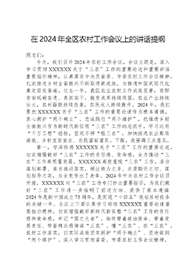 在2024年全区农村工作会议上的讲话提纲同志们:今天,我们召开2024年农村工作会议,会议主题是,深入学习贯彻XXXXXX关于三农工作的重要论述和重要讲话重要指示精神,认真落实中央及省委、市委农村工作会议精神,扎实推进乡村全面振兴不断取得新成效,为推进中国式现代化奠定坚实基础。过去一年,我区农业农村工作成效显著,贵阳贵安砥砺奋进、真抓实干,脱贫成果持续巩固,农业产业持续壮大,农村面貌持续改善,农民收入持续提升。2024年,我们要把XXXXXX关于三农工作的重要论述作为根本遵循,衷心拥护两个确立、忠诚践行两个维护,把推进乡村全面振兴作为新时代新征程三农工作的总抓手,学习运用千万工程经验,坚定不移强三农,加快促进农业高质高效、乡村宜居宜业、农民富裕富足。下面,我强调三点意见。第一,学深悟透XXXXXX关于三农工作的重要论述,切实增强做好三农工作的责任感、使命感,全力推动三农工作高质量发展。XXXXXX高度重视三农工作,亲自谋划部署、亲自推动落实,倾注精力之多、关爱期许之切、谋划指导之实,为全党作出了表率。2024年中央农村工作会议召开前,XXXXXX对三农工作专门作出重要指示,为我们做好三农工作进一步指明了前进方向、提供了根本遵循2024年是新中国成立75周年,是实现十四五规划目标任务的关键一年。全区上下要认真学习领悟XXXXXX重要论述重要指示精神,切实增强做好新时代新征程三农工作的责任感和使命感,牢记国之大者,始终带着政治使命、带着发展责任、带着群众感情谋三农、懂三农、抓三农,抓好工作落实,以实际成效坚定拥护两个确立、坚决做到两个维护。深入学习贯彻省委、市委农村工作会议精神,落实学习运用千万工程经验全面推进乡村振兴要求,自觉把思想和行动统一到上级决策部署上来,迅速掀起学习宣传贯彻热潮,做到学深悟透、入脑入心,凝聚起推动农业农村高质量发展的强大合力。明确今年农业农村工作重点任务,做到把方向明思路、守底线突重点、抓统筹保落实,抓好耕地保护和粮食安全、巩固脱贫攻坚成果等底线任务,学习运用千万工程经验,以四在农家·和美乡村为载体,突出重点、补齐短板,持续提升乡村产业发展水平、乡村建设水平、乡村治理水平,以强三农实效助推高质量发展。要深入学习贯彻XXXXXX重要讲话重要指示精神,准确把握当前三农工作面临的新形势新任务,始终保持清醒认识,知难而进、攻坚克难,切实增强做好新时代三农工作的责任感使命感,不断开创三农工作新局面。第二,准确把握年度三农重点工作任务,有力有效推进乡村全面振兴,坚持农业农村优先发展,推动三农各项重点任务落细落实。细化工作举措,狠抓贯彻落实,结合我区农业农村工作重点,项目化推进、清单式管理,明确具体举措、责任单位、责任人、完成时限,以钉钉子的精神抓好落实。要以建设农业强区为牵引,统筹抓好稳粮保供、现代农业、农村改革、脱贫攻坚与乡村振兴有效衔接等重点工作。切实抓实粮食和重要农产品稳产保供、守牢不发生规模性返贫底线、提升乡村产业发展水平、推进和美乡村建设、提升乡村治理水平、深化农村改革和农业对外开放。提高产业效益、加强公共服务、补齐要素短板,以更大的决心、更实的举措加快解决存在的问题。融会贯通运用,提高做好三农工作的精准性和实效性。学习运用千万工程所蕴含的理念和方法,集中力量办实事,奋力走出一条具有我区特色的乡村振兴之路、共同富裕之路。提升乡村产业发展水平,优化乡村特色产业布局,推进农产品精深加工,乡村产业融合发展,农业绿色可持续发展,加强农村流通服务体系建设。以创新推动基层社会治理为重点,有的放矢推进农村人居环境整治,积极抓好矛盾纠纷排查化解,进一步加强和规范村务公开,完善村级组织管理运行机制,全面提升基层治理能力水平。提升乡村治理水平,持续提升基础治理能力,创新发展优秀农耕文化,持续推进农村移风易俗,开展平安乡村创建活动。要强化科技和改革双轮驱动,实施农业科技创新行动、种业振兴行动、农机装备补短板行动,深化农村重点领域改革。要强化农民增收举措,培育新型农业经营主体,推动农村劳动力转移就业,落实强农惠农政策,壮大新型农村集体经济。第三,坚持和加强党对三农工作的全面领导,充分发挥党委统揽全局、协调各方的作用,为推进乡村全面振兴提供坚强保障。当前,全面建设社会主义现代化国家,最艰巨最繁重的任务仍然在农村。打赢农业农村发展硬仗,必须坚持党对三农工作的全面领导,坚持五级书记抓乡村振兴,加大政策倾斜支持力度,深化改革创新,充分激发农村发展动力活力,增强做好三农工作的能力本领,以优良作风推进乡村全面振兴。要大力推进实施乡村振兴战略,做到统筹部署、协调推进,稳住农业基本盘,夯实三农基础,走