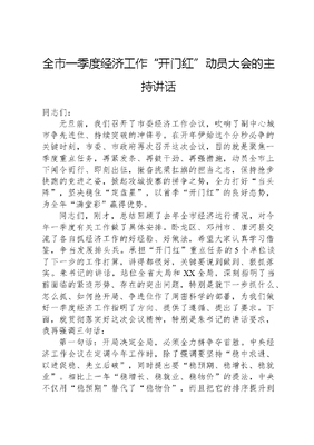 全市一季度经济工作开门红动员大会的主持讲话同志们:元旦前,我们召开了市委经济工作会议,吹响了副中心城市争先进位、持续突破的冲锋号。在开年伊始这个分秒必争的关键时刻,市委、市政府再次召开这次会议,目的就是聚焦一季度重点任务,再紧发条、再鼓干劲、再强措施,动员全市上下闻令而行、即刻出征,振奋挑梁扛旗的担当之志,保持抢步快跑的竞进之姿,掀起攻城拔寨的拼争之势,全力打好当头阵,坚决稳住定盘星,以首季开门红的良好态势,为全年满堂彩赢得优势。同志们,刚才,总结回顾了去年全市经济运行情况,对今年一季度有关工作做了具体安排。卧龙区、邓州市、唐河县交流了各自抓经济工作的好经验、好做法,希望大家认真学习借鉴,争当发展排头兵。承担开门红重点任务的5个单位谈了下一步的工作打算,讲得都很好,关键要说到做到、狠抓落实。朱书记的讲话,站位全省大局和XX全局,深刻指明了当前面临的紧迫形势、存在的突出问题,特别是就下一步抓什么、怎么抓、如何抢开局、争进位作了周密科学的部署,为我们做好一季度经济工作指明了方向、提供了遵循、提出了要求。下面,就贯彻落实好这次会议精神,特别是朱书记的讲话要求,我再强调三句话:第一句话:开局决定全局,必须全力拼争夺首胜。中央经济工作会议在定调今年工作时,除了强调要坚持稳中求进、以进促稳、先立后破,同时提出要稳预期、稳增长、稳就业。相比上一年稳增长、稳就业、稳物价的提法,中央不仅用稳预期替代了稳物价,而且把它的排序提升到三稳之首,重视程度不言而喻。一季度是全年的风向标,对于XX来说,实现一季度经济工作开门红,更是建强副中心关键之年的关键之战,事关预期、事关信心、事关全局,对于我们保持好的发展态势、趋势和气势意义十分重大。元旦过后第一个工作日,省里就紧锣密鼓举行了第十一期三个一批活动,这也是省委、省政府连续4年以抓项目、抓经济开启新一年的工作,起步就是冲刺、开局就是决战的导向非常鲜明。全国各地也都动了起来,通过召开新年第一会、发布政策、集中开工、产业对接等方式,掀起了新一轮拼经济的热潮。比如,1月13日,襄阳在天津举行了津襄经济文化交流活动,并召开了襄阳(京津冀)招商推介会;1月4日,郑州公布了今年第一批面向民间资本推介的项目,一共有44个,总投资超过1000亿元。由此可见,抢开局、抓起步已经成为各地的一致共识、自觉行动,谁慢了谁就要掉队,谁停了谁就会出局。同时,一季度还是个很特殊的时段,期间夹着春节长假,天气又复杂多变,对稳生产、推项目、保安全等都会带来一定影响,真正有效的工作时间其实非常有限。各级各部门一定要打消歇口气再干过完年再说的想法,真正紧张起来、行动起来,拿出只能进不能退的拼劲、只能紧不能松的韧劲、只能胜不能败的狠劲,迅速投入到拼争一季度、夺取开门红的各项工作中来,持续巩固稳的基础、积蓄进的力量,努力为实现全年目标任务争取主动权、打下好基础。第二句话:聚焦方能聚力,必须紧盯重点求突破。关于做好一季度经济工作,朱书记从以快制胜、强势开局,拼搏奋进、勇争第一,严防风险、守牢底线,高效担当、抢抓落实四个方面,做了全面系统的强调部署。在具体工作中,重中之重是要做到三快三提:三快,一是资金争取要快。这是当前最为紧要的工作。自去年年底开始,从中央部委到省直厅局,各领域政策措施和资金项目密集出炉,不仅覆盖广、数额大,而且窗口短、竞争强,争到了就是真金白银,错过了就于事无补。上周我安排相关同志去北京汇报对接,他回来就很感慨,说很多国家部委门庭若市、人流不息,其中不少都是地市去跑项目的同志。所以,希望在座的大家也能尽快加入到他们中去,多汇报、多对接、多争取,努力在进盘子切蛋糕上争取更多支持。二是招商引资要快。今年市委确定的目标是落地项目1000个、资金1万亿,要实现以周保月、以月保季、以季保年,每个月就要完成将近85个项目、850亿资金,任务非常艰巨,一天也不能浪费。五大战区要切实当好先锋队,各县市区也要充分发挥能动性,尤其要利用好春节这个有利时机,一方面走出去,多到目标企业去拜年慰问、建立联系;另一方面请进来,多与回乡过年的企业家、老板会面交流、增进感情,借助喜庆祥和的节日气氛,促成互利共赢的合作美事。三是项目建设要快。全省第十一期三个一批活动中,我们签约了43个项目,按照省里的要求,这些项目一季度开工率要达到70%,这是硬杠杠,必须坚决完成。同时,对于列入省重点建设项目名单的项目,以及在建、续建和新开的市重点项目,要开展集中攻坚行动,力争在一季度完成更多的投资、形成更多的实物量。特别是,近期低温天气持续,各地要科学合理调配施工力量,在保证项目进度的同时,坚决杜绝安全事故发生。三提,一是要提升政策落地的实效性。前不久,省政府围绕