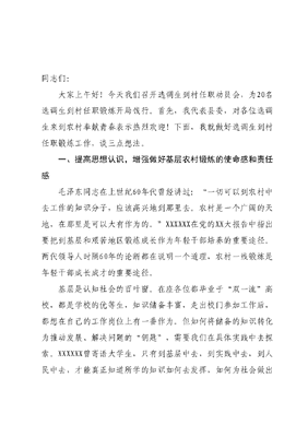 同志们:大家上午好!今天我们召开选调生到村任职动员会,为20名选调生到村任职锻炼开局饯行。首先,我代表县委,对各位选调生来到农村奉献青春表示热烈欢迎!下面,我就做好选调生到村任职锻炼工作,谈三点想法。一、提高思想认识,增强做好基层农村锻炼的使命感和责任感毛泽东同志在上世纪60年代曾经讲过:一切可以到农村中去工作的知识分子,应该高兴地到那里去。农村是一个广阔的天地,在那里是可以大有作为的。XXXXXX在党的XX大报告中指出要把到基层和艰苦地区锻炼成长作为年轻干部培养的重要途径。两代领导人时隔60年的论断都在说明一个道理,农村一线锻炼是年轻干部成长成才的重要途径。基层是认知社会的百叶窗。在座各位都毕业于双一流高校,都是学校的优等生,知识储备丰富,走出校门参加工作后,都想在自己的工作岗位上有一番作为。但如何将储备的知识转化为推动发展、解决问题的钥匙,需要我们在具体实践中去探索。XXXXXX曾寄语大学生,只有到基层中去,到实践中去,到人民中去,才能真正知道所学的知识如何去发挥,如何为社会做出自己的贡献。所以,在大家踏入工作岗位的第一年,组织就把大家派到农村锻炼,目的就是要让大家在离群众最近的地方,直接感受农村的面貌和现状,亲身体会农村工作的酸甜苦辣,真正认知社会、了解民情。大家一定要牢牢把握住这非常难得的锻炼机会,发挥你们的年龄、学历和专业优势,把基层工作了解透彻、把基层实际牢记于心。只有这样,你们再回到选调单位的工作岗位,说出来的话,写出来的材料,实施的政策,才能更接地气,更符合基层实际,更贴近群众需要。基层是磨砺意志的训练场。艰难困苦,玉汝于成。纵观历史没有任何一个国家、一个朝代的繁荣强盛是轻轻松松敲锣打鼓就能实现的,必须经历一系列的艰难险阻。对于年轻干部成长成才来说,也是同样的道理。在基层工作,每天都会直面问题、直面百姓,无论是调处纠纷、信访维稳,还是文明创建、卫生整治,都需要基层一线干部在不断努力、反复沟通协商中推动完成,这其中比拼的不仅是解决问题的能力,更是屡败屡战、坚定不移的意志力。前几批的选调生,经历了很多场考验,工作表现都比较好。比如,在乡村振兴任务中,千方百计为农户销售农产品找路子、出点子,有的选调生将土特产搬到网络平台进行销售,还有的选调生为农产品拍视频、做宣传。经历了这些磨砺,他们的经验更丰富了、阅历更完整了、能力更扎实了。各位选调生要传承和发扬历届选调生的优秀品质,在广阔的农村舞台上磨砺成长、施展才华。二、珍惜把握机会,在基层广阔天地中淬炼自我、增长才干干部的成长,既离不开组织的培养,也要靠自身的努力。组织搭建平台只是为大家今后的成长提供了一个台阶,能否利用好这个平台,以脚踏实地、求真务实的作风投入到具体实践中去,关键还是要靠各位自身的拼搏。一是要坚守政治立场、对党绝对忠诚。XXXXXX多次强调,优秀年轻干部必须对党忠诚,信念坚定。各位选调生都是党和国家事业的接班人,必须要始终将对党忠诚这一个政治信念入脑入心入行,把坚定理想信念作为安身立命的主心骨,修身立业的压舱石。只有信念坚定,遇到挫折才能撑得住,关键时刻才能顶得住风吹雨打面前才能扛得住。大家一定要把讲政治落实到具体实践中,体现到一言一行中。同时,还要把作风和纪律挺在前面,严格遵守党的政治纪律、工作纪律和群众纪律,做政治上的明白人工作中的清醒人和老百姓的贴心人。二是要转变心态、脚踏实地。XXXXXX曾在中青年干部培训班开班式上强调,广大青年干部要立志做大事,保持和平心态。我觉得各位选调生在心态上要有两个方面的转变。一是要尽快适应农村环境,各位选调生都是95后,还有一部分是00后,很多选调生可能会对农村的工作不熟悉、不适应。和中心城区相比,农村少了大都市的热闹和繁华,没有便利的生活服务设施,住宿和餐饮条件可能也相对一般,大家要端正心态、转变角色、尽快融入二是要保持归零心态,能够考上选调生,说明大家在学生时代都很优秀,父母以你们为骄傲,身边的人也可能以你们为榜样但是,大家到了基层之后,会发现周边的村干部、老党员,虽然学历层次没你们高,但是他们在化解矛盾纠纷、处理疑难杂症等方面有自己独特的方式方法。所以,大家一定要以归零的心态,多向村干部、老党员、老同志虚心求教,稳扎稳打、脚踏实地,努力在一线实践中积累基层工作经验、掌握群众工作方法。三是要发挥优势、助力发展。从今天起,大家都要在村里至少工作一年的时间,这段时间说长不算长,说短也不短,把握住了,可以做成很多事情,把握不住,蜻蜓点水过起来也很快。到了村里,相比周围的同事,各位选调生的文字功底更强、思路也更活跃,希望大家能够认清自己的优势,发挥好长处,在完成村内事务性工作的同时,利用好我们搭建的各类平台。此外,还要积极参与到全面实施乡村振兴战略的火热实践中去,比如,可以利用专业优势,打造村内的特色党