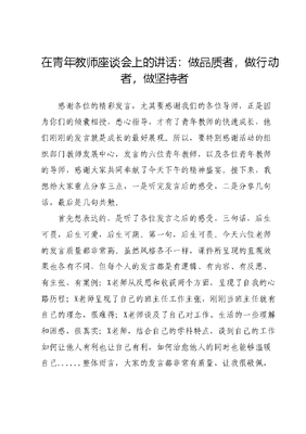 在青年教师座谈会上的讲话:做品质者,做行动者,做坚持者感谢各位的精彩发言,尤其要感谢我们的各位导师,正是因为你们的倾囊相授,悉心指导,才有了青年教师的快速成长,他们刚刚的发言就是成长的最好展现。所以,要特别感谢活动的组织部门教师发展中心,发言的六位青年教师,以及各位青年教师的导师,感谢大家共同奉献了今天下午的精神盛宴。接下来,我想给大家重点分享三点,一是听完发言后的感受,二是分享几句话,最后是几句共勉。首先想表达的,是听了各位发言之后的感受,三句话,后生可畏,后生可爱,后生可期。第一句,后生可畏。今天六位老师的发言质量都非常高。虽然风格各不一样,课件所呈现的直观效果也各有不同,但每个人的发言都是有逻辑、有内容、有反思、有主张、有案例:X老师从反思和收获两个方面,呈现了自我的心路历程;X老师呈现了自己的班主任工作主张,刚刚当班主任就有自己的理念,很难得;X老师谈及了自己对工作、生活的一些理解和困惑,很真实;X老师,结合自己的学科特点,谈到自己的工作如何让他人有利也让自己有利,如何治愈他人的同时也能够温暖自己整体而言,大家的发言都非常有质量,让我很敬佩,敬佩你们的发言内容,更敬佩你们的行动实践,因为你们是真实做出来的,而且做得非常好。第二句,后生可爱。今天发言的六位老师,包括点评的X老师、X老师、X老师、X老师等都非常可爱可以说是你们浓烈的青春气息感染了我。X老师谈到和学生的距离X老师讲述过程中感动自己,这都是非常真实的情感流露。因为你们讲述的是自己真实的生活,你们为此投入了最真实、最充沛、最热烈的情感。所以我觉得今天的分享,大家呈现了非常真实的一面,因为真实,所以可爱,这种青涩的反思、青涩的丰富、青涩的理性,恰恰让人无限感动。第三句,后生可期。因为你们的优秀、实干、热情,所以你们的未来是值得期待的。而你们的未来就是学校的未来,所以学校的未来也必然值得期待。其次,作为一位曾经年青过的教师,作为学校的管理者,想给大家分享三句话。第一句话,志存高远,追求卓越,高追求,做品质者。李利老师刚才分享时说过一个观点,每个人对成功的理解不一样,我很认同。那么,针对教师这一职业,我想我们理解的成功可能有这么三种情况。第一种情况就是通常意义上的,做一位学术名师,或者从事学校管理工作。前者,让更多的学生因为我而改变;后者,尽我们所能去追求一种理想的教育。第二种情况,可以没有名师的头衔,但是被学生、被家长、被同事尊重。注意我用的是尊重,不是喜欢,喜欢和尊重是文可居文库——海量学习资料,手机电脑下载www.wenkeju.com两种情况。被学生、家长、同事尊重要靠什么?靠实力。你的实力,要么来自你的人格,要么来自你的专业,要么来自你的成就所有的尊重尊严都是要用实力来捍卫的。第三种情况,我们把它降到最微观的程度,教师的主阵地课堂,能不能让你的课堂彰显出专业的品质。长郡中学的龚校长曾讲过他们对老师的六不要求,大家看一看你现在能做到多少,三年后又能做到多少。上课不出错,下课不拖堂,作业不过量,试卷不过夜,学生问不到,陪伴不缺席。刚刚讲的三种情况,都可以理解为成功,就看你追求哪一层。但是,作为教师,让你的课堂成为学生向往的地方,是我们对自己工作成功的基本定义。当然,我更希望我们在座的诸位能够去追求成为名师,成为有影响力的专业的引领者、领航者。只要你愿意,学校会竭尽全力支持你。第二句话,一分耕耘,一份收获,勤付出,做行动者。刚刚六位发言老师,其它讲的是就自己的实际行动。一是反思。孙一涵老师分享中讲到梳理自己的感悟,就是反思。如果可能,希望大家能够把反思形成文字,它的要求更高,但它的影响更深远。二是听课。听导师的课,听同组老师的课,听石室老师的网课。我刚刚参加工作的时候,先备课,然后听导师的课,然后修改教案,最后才是上课,成长特别快。三是做题。高考学科是必须要做题的。你给学生布置的作业,你首先要做一遍,才能判断这些文可居文库——海量学习资料,手机电脑下载www.wenkeju.com题适不适合自己的学生。如果布置的作业自己没做过,对不起,我觉得你在布置作业的时候是不负责任的。四是上公开课、做交流分享,就像今天一样。现在你们无论是上公开课还是做交流发言,都拥有一个资本——年轻。因为年轻,所以你们现在有试错的成本。要敢于亮出自己,不要怕。当你们站上发言席时,站上公开课的讲台时,你就已经成功了,因为你敢于接受这个挑战,这本身就是成功。寒假即将来临,希望我们所有人不仅仅是年青老师,包括我们的导师、行政干部,寒假都能给自己立一个小小的flag。比如,这个寒假我要读完一本书,我要写两篇反思,我要备几周的课,我要做几套试卷,等等。在学校布置的寒假作业之外,再给自己加点餐。现实和理想之间是湍急的河流,河流之上是什么?就是桥梁,