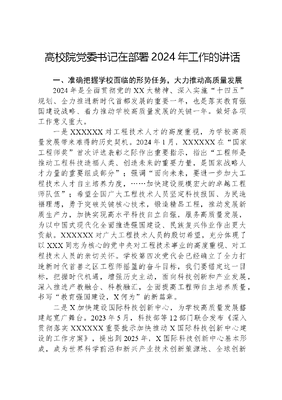 高校院党委书记在部署2024年工作的讲话一、准确把握学校面临的形势任务,大力推动高质量发展2024年是全面贯彻党的XX大精神、深入实施十四五规划、全力推进新时代首都发展的重要一年,也是落实教育强国建设战略、着力推动学校高质量发展的关键一年。做好各项工作意义重大。一是XXXXXX对工程技术人才的高度重视,为学校高质量发展带来难得的历史契机。2024年1月,XXXXXX在国家工程师奖首次评选表彰之际作出重要指示,指出工程师是推动工程科技造福人类、创造未来的重要力量,是国家战略人才力量的重要组成部分;强调面向未来,要进一步加大工程技术人才自主培养力度,……加快建设规模宏大的卓越工程师队伍;希望全国广大工程技术人员坚定科技报国、为民造福理想,勇于突破关键核心技术,锻造精品工程,推动发展新质生产力,加快实现高水平科技自立自强,服务高质量发展,为以中国式现代化全面推进强国建设、民族复兴伟业作出更大贡献。XXXXXX对广大工程技术人员的殷切希望,充分体现了以XXX同志为核心的党中央对工程技术事业的高度重视、对工程技术人员的亲切关怀。学校第四次党代会已经确立了全力打造新时代首善之区工程师摇篮的奋斗目标,我们要锚定这一目标,把握时代机遇,增强历史主动,面向科技创新和产业发展,深入推进产教融合、科教融汇,全面提高工程师自主培养质量,书写教育强国建设,X何为的新篇章。二是X加快建设国际科技创新中心,为学校高质量发展搭建起宽广舞台。2023年5月,科技部等12部门联合发布《深入贯彻落实XXXXXX重要批示加快推动X国际科技创新中心建设的工作方案》,提出到2025年,X国际科技创新中心基本形成,成为世界科学前沿和新兴产业技术创新策源地、全球创新要素汇聚地。2024年1月,市人大会议审议通过《X国际科技创新中心建设条例》,为高质量建设国际科技创新中心提供了法制保障。X围绕创新发展、科技领域改革和人才高地建设出台了系列政策文件,引领推动了产业创新和新质生产力的发展,为学校高质量发展创造了良好的区域发展环境。作为一所市属高校,我们要主动服务融入X,积极落实《条例》规定,优化学科专业布局,推进新兴学科、交叉学科建设,强化有组织科研,培养创新团队,以创新促质优,以有为谋有位,更充分融入首都发展和京津冀协同发展的舞台,加快实现自身高质量发展。三是市属高校分类发展深入推进,为学校高质量发展注入强劲动力。2020年5月,X市印发了《X市属公办本科高校分类发展方案》,我校被定位于高水平应用型大学。2022年以来,市教育两委多措并举引导激励市属高校分类发展,以分类发展项目和新兴交叉学科平台为抓手、以财政拨款改革为切入点推动高校聚焦优势特色,以绩效考核机制改革为切入点推动人事制度改革,以质量评价改革为切入点推动高校办学水平提升等。分类发展指挥棒日渐清晰,对学校既是挑战,又是助推学校办好高水平应用型大学的强大动力。我们必须坚定信心、增强勇气、提质增速,坚定不移走好应用型大学高质量发展之路,努力从跟跑到并跑并敢于向领跑转变。即将迎来的新一轮本科教育教学审核评估,就是教育部、X市等教育主管部门对学校应用型人才培养质量的集中检验,是提升学校应用型大学办学水平的有利契机。我们要把握这次大考和亮相机会,切实在内涵质量上下功夫,推动学校各方面工作提升高质量发展水平。二、牢牢把握今年工作总要求,全面展现新气象新作为今年工作总体要求是,坚持以XXX新时代中国特色社会主义思想为指导,全面贯彻落实党的XX大精神和XXXXXX关于教育的重要论述、对X重要讲话精神,落实市委十三届四次全文可居文库——海量学习资料,手机电脑均可下载www.wenkeju.com会等精神,牢牢把握教育的政治属性、战略属性、民生属性,落实立德树人根本任务,坚持稳中求进、以进促稳、先立后破,坚持以落实教育强国部署为主线,以服务新时代首都发展为着力点,以提高人才自主培养质量和能力为出发点和落脚点,深入实施党建引领、育人为本、双轮驱动、内外支撑发展战略,凝心聚力、真抓实干,大力推动高质量发展,全力打造新时代首善之区工程师摇篮,加快建设特色鲜明高水平应用型大学。工作中要重点把握好以下几点:一是坚持服务大局,积极主动作为,围绕X四个中心功能建设,立足高水平应用型大学办学定位,为首都率先基本实现社会主义现代化作出贡献。二是坚持稳中求进,树牢首善标准,把握好办学规模与资源效率之间的关系,注重提质量、增效益,推动量的合理增长与质的有效提升相统一。三是坚持改革创新,强化系统观念,推动局部微切口改革的精准性与全局性相统一,用创新的思维和改革的办法破解发展难题。四是坚持底线思维,增强忧患意识,压紧压实安全生产责任,加强风险研判,持续排查整治校园安全隐患,更加注重学生心理健康