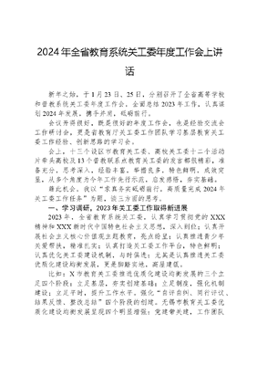 2024年全省教育系统关工委年度工作会上讲话新年之始,于1月23日、25日,分别召开了全省高等学校和普教系统关工委年度工作会,全面总结2023年工作,认真谋划2024年发展,携手并肩,砥砺前行。会议开得很好,既是很好的年度工作会,也是经验交流会工作研讨会,更是省教育厅关工委工作团队学习基层教育关工委工作经验、创新思路的学习会。会上,十三个设区市教育关工委、高校关工委十二个活动片牵头高校及13个普教联系点教育关工委的发言都很精彩,准备充分,思考深入,经验丰富,举措良多,特色鲜明,成效突显,从多个角度为今年工作先行示范,启发感悟,夯实基础。籍此机会,我以求真务实砥砺前行,高质量完成2024年关工委工作任务为题,谈三方面的思考。一、学习调研,2023年关工委工作取得新进展2023年,全省教育系统关工委,认真学习贯彻党的XXX精神和XXX新时代中国特色社会主义思想,深入到位;认真开展社会主义核心价值观主题教育,亮点纷呈;认真推进青少年关爱帮扶,精准扎实;认真打造关工委工作平台,特色鲜明;认真优化关工委建设机制,与时俱进;尤其是认真推进关工委优质化建设均衡发展,更是脚踏实地,高屋建瓴。比如:X市教育关工委推进优质化建设均衡发展的三个立足四个阶段:立足基层,夯实创建基础;立足制度,强化机制建设;立足平时,提升工作水平。强化自评自纠、同行评议、结果反馈、整改总结四个阶段的创建。无锡市教育关工委优质化建设均衡发展呈现四个明显增强:党建带关建,工作团队实力明显增强;深化主题教育,基层调研成效明显增强;推进五史教育,五老报告团美誉明显增强;紧扣新时代,一校一品质量明显增强。XX市教育关工委优质化建设的四位一体:明进度,走程序,严标准,强督查,相辅相成。同时,推进心理健康进校园,持续打造阳光班、关爱超市、儿童乐园、向日葵读书谈心屋等,已成家校共育的联系纽带、青少年健康成长的温馨家园、孩子们人生道路的心灵港湾。X市教育关工委以有工作得宣传,遇活动就报道;工作带动宣传,宣传促进工作为宗旨,学字当头,坚持正确方向;干字为先,悟透内容载体;快字为诀,尽快成稿发稿。让关工委工作的时代感、主动性和实效性,敲开百姓家门,打开家长和孩子的心门。X市教育关工委深化优质均衡,促进关工工作全面发展。强化学习,明确目标;健全机制,整体把关;结合实际,落实落细。充分发挥关工委督导团职能,把优质化建设目标任务融入到月督导内容,细化到每一次实地调研、每一次参加活动之中,务实推进关工委优质化建设均衡发展。南通市教育关工委将第四次优质化建设推进会开到基层,开到学校,打好基础促发展,精耕细作求实效。着力打造关工品牌,双千银发助双减,教育五老投身双减,既是进学校、进社区、进乡村的编外教师,又是双减政策宣传员、校外培训监督员、家庭教育辅导员。连云港市教育关工委加强中小学校关工委优质化建设均衡发展,统一标准,抓均衡;加强指导,促均衡;严格考核,保均衡。坚持全市一盘棋,统一部署要求,统筹计划、整体推进。明确创建要求,落实创建细则,层层传导,级级推动。淮安市教育关工委攻坚克难,完善基层组织建设;加强培训,提升基层队伍素质;培育典型,强化基层示范引领;科学考核,切实减轻基层负担。实现四个首次,首次评选一校一品工作品牌,首次评选示范性关工委校际联盟和一站文可居文库——海量学习资料,手机电脑均可下载www.wenkeju.com两室,首次评选优质化建设示范校,首次评选中小学关工委建设优秀案例。盐城市教育关工委专门成立分管局领导任组长的优质化建设均衡发展考评领导小组,考评工作涵盖学习观摩、交流促进、调研分析、创新研讨、经验推广,以考评促优质均衡。以两个菜单对接,使得一帮四关爱品牌熠熠生辉。扬州市教育关工委已持续10年的学生法治课间餐品牌特色更亮眼。实际、实用、实效的正餐+课间餐=营养餐,新增了三个每:每位学生做一期法治手抄报,每个班级开一次法治主题班会,每所学校办一场模拟法庭等新内涵。镇江市教育关工委的三个抓,抓好根本,突出学习贯彻党的XXX精神;抓牢重点,突出优质化建设均衡发展;抓实常态,突出关爱特殊群体。做好二入:把关工委工作纳入党政工作,融入德育工作;三同:关工委工作与党政工作一同研究、一同布置、一同考核;四一:党政主要领导每学期听一次关工委工作汇报、参加一次关爱活动;学校关工委每学期发一份关爱工作菜单、举办一次关工委重大活动。泰州市教育关工委的优质化建设与全市教育党建一体谋划,同推进,同落实,同考核,形成党建带关建,关建促党建工作机制。六一关爱周品牌活动推进16年,强化关爱青少年生命健康润心行动,使得三童(残疾儿童、留守儿童、特困家庭儿童)人人有结对,学业有指导,亲情有呵护,生活有保障。宿迁市教育关