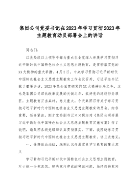 集团公司党委书记在2023年学习贯彻2023年主题教育动员部署会上的讲话同志们:以县处级以上领导干部为重点在全党深入开展学习贯彻习近平新时代中国特色社会主义思想主题教育,是贯彻落实党的XX大精神的重大举措。4月3日,中央学习贯彻习近平新时代中国特色社会主义思想主题教育工作会议召开,习近平总书记做了重要讲话。2023年是全面贯彻党的XX大精神开局之年,这也是集团公司深化改革发展的关键之年,抓好党的建设任务艰巨,主题教育正当其时,意义重大。今天集团召开关于学习贯彻习近平新时代中国特色社会主义思想主题教育动员会,内容重要,任务紧迫。刚才党委副书记××同志对《集团公司开展习近平新时代中国特色社会主义思想主题教育实施方案》作了说明,请集团各级党组织认真贯彻落实。下面,我围绕学习贯彻习近平新时代中国特色社会主义思想主题教育,讲三点意见:一、提高政治站位,深刻认识开展党史学习教育的重大意义学习贯彻习近平新时代中国特色社会主义思想主题教育,对于统一全党思想、解决党内存在的突出问题、始终保持党同人民群众血肉联系、推动党和国家事业发展,具有重要意义。自集团公司组建以来,集团党委认真落实中央部署,坚持把方向,管大局、促落实的职能定位,坚持党建引领,将党建工作融入生产经营全过程,开展基层党组织规范化建设,强化党员教育管理,以国企担当积极参与城市基层治理,提升城市建设品质,不断解决绿化、市政等群众急难愁盼,提升民生福祉,为我市经济社会建设发挥主力军作用,但在党建工作仍存在短板,压力传导有所弱化、党建创新发展还有待进一步提升,在这种情况下开展学习贯彻习近平新时代中国特色社会主义思想主题教育,具有重要且深远的意义。(一)开展这次主题教育,是建强堡垒的重要举措当前,集团在抓党员理论学习的系统性还有欠缺,面临新的战略机遇、新的战略任务、新的战略阶段、新的战略要求、新的战略环境,用习近平新时代中国特色社会主义思想指导实践、推动工作能力还有待增强,在用习近平新时代中国特色社会主义思想凝心铸魂方面,不够科学有效,还没真正融入血脉中,没完全转化为宝贵的精神财富,作用也未能充分彰显。这些问题看似分布在不同层级党组织,但根源在于顶层设计不科学,这就要求我们必须通过学习贯彻习近平新时代中国特色社会主义思想,在不断完善全面从严治党体系的同时推进各项责任延伸到每一层组织、每一个干部和党员。因此,开展这次主题教育,对于我们来说非常必要。(二)开展这次主题教育,坚持以人民为中心的重要之题在今年年初的工作会上,我们深入研究部署了今年工作,紧抓城市更新机遇,坚持践行人民城市为人民理念,主动作为,勇挑重担,坚定信心,不讲困难、不讲条件,高起点、高标准、高质量完成今年工作目标,加快推进××体育场馆改造项目建设、水源地管网施工等民生实事建设,积极拓展新产业,开展新能源建设,第一季度我们开展了春季洗道清理垃圾死角清洁环卫设施清理建筑垃圾、生产垃圾农村存量垃圾整治、水源地沟渠整治、大棚点整治春季植树等专项行动,取得初步成效。面对当前去美元化趋势逐渐蔓延、俄乌局势日益胶着等重大国际事件有可能带来的行业变革,市场竞争也带来更多挑战,我们在业务结构、管理水平、人才队伍、体制机制等方面存在短板带来的挑战,等等。面对这些困难与挑战,迫切需要通过学习贯彻习近平新时代中国特色社会主义思想加以解决,以学习成果解决发展问题、加强企业党的建设,强核心、固堡垒、当先锋,把工作部署从施工图变为行动路线图,为建设宜居城市中强化国企担当,让人民群众有更多获得感幸福感和安全感。(三)开展这次主题教育,是推进企业高质量发展的务实之行一语不能践,万卷徒空虚。在全党深入开展学习贯彻习近平新时代中国特色社会主义思想主题教育,对于统一全党思想、解决党内存在的突出问题、始终保持党同人民群众血肉联系、推动党和国家事业发展,具有重要意义。今年,改革发展中的集团综合实力需更加增强,国企品牌影响力需更加提升,要做强做优做大集团,迫切需要建强干部队伍领头雁、培育干事创业生力军,我们要在学习四史中不断加强思想淬炼、政治历练、实践锻炼,以挑最重的担子,啃最硬的骨头的韧劲,研究破解集团改革发展中的新问题新情况,全力推进各项工作扎实开展,超额完成×××万元净利润工作目标。二、明确目标任务,确保这次主题教育取得实效开展这次主题教育,总要求是学思想、强党性、重实践、建新功,这就要求我们要以高度的政治自觉、饱满的政治热情、严肃的政治态度投身主题教育。我们要注意在开展主题教育的方式方法上坚持守正创新,不能盲目追求亮点,而要抓住实际效果,让以学铸魂、以学增智、以学正风、以学促干看得到、摸得着。(一)要用新要求补足精神之钙习近平总书记在主题教育工作会议上的重要讲话,是马克思主义中国化的最新理论成