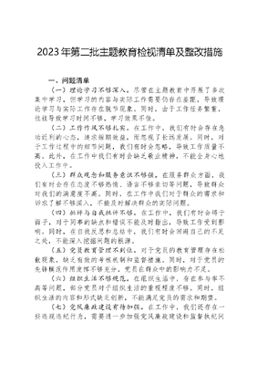 2023年第二批主题教育检视清单及整改措施一、问题清单(一)理论学习不够深入。尽管在主题教育中开展了多次集中学习,但学习的内容与实际工作需要仍存在差距,导致理论学习与实际工作存在脱节现象。同时,由于工作任务繁重,往往导致学习时间不够,学习效果不佳。(二)工作作风不够扎实。在工作中,我们有时会存在急功近利的心态,追求短期效益,而忽视了长远发展。同时,对于工作过程中的细节问题,我们有时会忽略,导致工作质量不高。此外,在工作中我们有时会缺乏敬业精神,不能全身心地投入工作中。(三)群众观念和服务意识不够强。在服务群众方面,我们有时会存在态度不够热情、语言不够亲切等问题,导致群众对我们的满意度不高。同时,在工作中我们对于群众的需求和诉求了解不够深入,不能及时解决群众的实际问题。(四)批评与自我批评不够。在工作中,我们有时会碍于面子,对于同事的缺点和错误不能及时指出,导致工作受到影响。同时,在自我反思和总结中,我们有时会回避自己的不足之处,不能深入挖掘问题的根源。(五)党员教育管理不到位。对于党员的教育管理存在松散现象,缺乏有效的考核机制和监督措施。同时,对于党员的先锋模范作用发挥不够充分,党员在群众中的影响力不足。(六)组织生活不够规范。在组织生活中,存在参与率不高等问题,部分党员对于组织生活的重视程度不够。同时,组织生活的内容和形式缺乏创新,不能满足党员的需求和期望。(七)党风廉政建设有待加强。在工作中,我们还存在一些违规违纪行为,需要进一步加强党风廉政建设和监督执纪问责。二、整改措施(一)加强理论学习。要制定长期学习计划,明确学习内容和目标,并严格执行。同时要加强对XXX新时代中国特色社会主义思想的学习,提高自身政治理论素养。通过读书交流、参加集中学习等方式,增强理论联系实际的能力。(二)改进工作作风。要树立正确的工作态度,增强责任心和主动性。在工作中要注重细节,追求高质量的工作效果。同时要树立敬业精神,全身心地投入工作中。通过加强团队合作、提高工作效率等方式,推动工作的顺利开展。(三)增强群众观念和服务意识。要时刻牢记全心全意为人民服务的宗旨意识,积极为群众办实事、解难事、做好事。同时要加强与群众的沟通联系,及时了解群众的意见和建议,积极回应群众关切。通过提高服务质量和水平、加强宣传等方式提升群众满意度。(四)加强批评与自我批评。要勇于开展批评与自我批评,及时指出同事的缺点和错误并帮助其改正。同时要深入挖掘自身问题的根源并积极改正。通过开展谈心交流、鼓励互相监督等方式促进批评与自我批评的开展。(五)加强党员教育管理。要建立健全党员教育管理制度并严格执行考核机制和监督措施。同时要充分发挥党员的先锋模范作用并加强对其宣传报道力度以提高其在群众中的影响力。通过加强培训、提供学习机会等方式提高党员素质和业务能力水平使其更好地发挥先锋模范作用;通过定期开展组织生活会、谈心谈话会等方式加强党员之间的交流与沟通并促进团结合作共同发展进步;通过加强对党员的监督和管理以及落实考核机制等方式严肃处理违规违纪行为并起到警示作用加强党风廉政建设;通过完善组织生活制度、丰富组织生活内容等方式提高参与率并增强组织凝聚力以更好地发挥党组织的战斗堡垒作用;通过加强对新形势下党员干部队伍建设的探索和研究等方式不断提高组织管理水平以适应新时代的发展需求和发展战略目标;最终为实现中华民族伟大复兴的中国梦而努力奋斗!