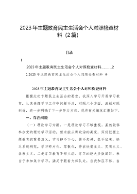 2023年主题教育民主生活会个人对照检查材料(2篇)目录1.2023年主题教育民主生活会个人对照检查材料.22.2023年主题教育民主生活会个人对照检查材料92023年主题教育民主生活会个人对照检查材料根据此次专题民主生活会的要求,我深入学习开展学习教育,认真查摆学习工作中问题不足,对照六个方面,深刻对照剖析,进一步明确了下一步努力方向。现将有关情况汇报如下。一、存在问题(一)理论学习方面。一是理论学习不够重视。虽然能够参加党的理论学习活动,但未能从讲政治的高度,深刻把握主题教育的重要意义,学习静不下心、提不起神、抓不住魂,缺乏系统研究,学习碎片化、零散化,存在快餐主义、实用主义、拿来主义。二是学习教育不够主动。学习的绝大多数篇目,来自于参加集中学习,满足于跟着大部队走,自我加压不够,自学热情不高,钻研精神缺乏,流于表面,对蕴含其中的精髓要义、历史逻辑研究较少。(二)政治素养方面。一是政治领悟力有待增强。能够严格遵守党的政治纪律和政治规矩,衷心拥护两个确立、坚决做到两个维护,自觉同党中央保持高度一致,但还存在着从政治高度审视、处理问题能力不够强的问题,对社会上、网络上传播的一些隐蔽性较强的负面信息警惕性不够。二是系统把握两个确立的内涵还有不足。对明确在两个确立的时代背景、重大意义、深刻内涵上还缺乏深层次的理解,对两个确立在新时代党和国家事业发展、推进中华民族伟大复兴历史进程上具有决定性意义领会还不深。比如,党的XX大报告指出了中国式现代化全面推进中华民族伟大复兴,领导班子在系统学习、深刻理解中,未能将事业发展置于中国式现代化的理论和实践发展中深入思考,从更深层次、更广范围谋划服务中国式现代化的破题思路还不明确,结合实际探索还不深入。(三)能力本领方面。一是自身本领不足。存在知识不够眼界不宽、能力不强的问题,特别是在推进现代化建设,很多事情没有先例可循,很多工作没有现成的模式的形势下,抓不准,也抓不住克服本领恐慌的成功密码,对照既要政治过硬,也要本领高强的标准,自己仅仅做到了练就堪当时代重任的宽肩膀硬脊梁,在练就真本领方面,精气神不足,思想和行动存在落差。二是工作的方式方法还需加强。自己缺乏提高思维能力的主动意识和科学方法,对事物演变规律、底层逻辑、内在机理的认识和理解不够系统全面,不善于运用历史思维能力总结历史经验、认识发展规律、把握前进方向,在回应时代之问的过程中,有时踩不到高质量发展的节奏上,无法高效解决问题,甚至错失了发展的最佳时机。(四)担当作为方面。一是政绩观树立和践行得不够牢固在思想深处上,还没有完全解决好树什么样的政绩、政绩为谁而树、怎样树政绩的问题,有时统筹谋划工作,安排部署任务,还是存在干快活、好落实、造亮点、出政绩的思维偏差,一些工作并没有达到打基础、利长远、惠民生、得民心的目的和要求。二是创新能力缺乏。由于工作时间长、任务重,开拓创新意识不够,敢为人先、敢闯敢试精神还需提升,有时出现庸懒散现象、工作粗浅慢、利益斤斤计较、纪律宽松软隐患等现象,不能用新思想推动工作。(五)工作作风方面。一是工作态度还需提高。面对新时代、新形势和新机遇,自己的思想观念调整和重塑的速度比较慢,对推进作风革命、效能革命的领导责任压得不实,导致慢进是退、不进更是退的使命感和紧迫感不强,速度意识和效率意识不足,导致推动工作高质量发展的动力不足。二是深入一线解决问题的意识还不够强。随着近几年各项工作压力的加大,各种考核任务的增多,有时存在群众观念弱化现象,坐等上门多,主动问需少,同师生主动沟通、主动关心少,扑下身子走进群众身边,近距离听取群众农心声做的还不够。(六)廉洁自律方面。一是运用法治思维还存在短板。面对新时代对领导干部纪法意识提出的新标准和高要求,自己主动学法、懂法、守法、用法的意识、压力和效率均有所不足,常常遵循以前的方式方法和习惯行为谋划和推进工作,用新时代的法治思维和法治方式看问题、做决策不够标准和规范,没有真正把学法嵌入岗位所需。二是廉政教育持续用力不足。履行一岗双责不够严实,不够到位,对思想道德教育的全面性、及时性、有效性有所欠缺,对那些日常工作和生活中不拘小节的思想行为,对于苗头性、倾向性问题,未能及时跟进地与干部谈心交心,摆现象、查事实、问根源、找原因。二、问题产生的原因分析一是政治素养还需提升。没有将党的政治建设摆在首位,在提高政治三力的方式方法也不够科学有效,自身的政治能力并没有随着年龄、党龄的增长而逐步增强,锤炼品格强化忠诚方面还有一定的差距,导致自己的世界观、人生观、价值观这个总开关有时出现松动,在理论学习、能力本领、担当作为、工作作风、廉洁自律等方面,也就出现了这样或那样的问题。二是服务群众宗旨意识不牢。还没能真正