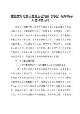 主题教育专题民主生活会党委(党组)领导班子对照检查材料根据召开2023年度主题教育专题民主生活会的具体指导意见本班子在会议中聚焦XXXXXX关于以学铸魂、以学增智、以学正风、以学促干的一系列重要论述进行了深入研究。会议紧扣专题民主生活会的主题,并紧密结合日常工作,广泛征求各方面的反馈和建议。深入进行谈心谈话,集中审视理论学习、政治素质、能力本领、担当作为、工作作风、廉洁自律六大关键领域严格进行对照自查,深入挖掘存在的问题,剖析其根源并确定改进的具体路径。现将对照检查的详细情况进行汇报:一、存在的主要问题(一)学习贯彻XXX新时代中国特色社会主义思想方面一是对于理论学习的深度和系统性仍有待提升。尽管党委中心组定期组织理论学习,但偶尔会出现学习过于浅显的情况。一部分党员尚未养成自我学习的常态,在即时学习、深入研究和持续钻研方面缺乏积极性和毅力。虽然在分管业务领域的学习较为深入,但对于非专业领域的知识掌握不够透彻,构建系统知识体系、理解核心要义、将知识内化的能力有待提升,距离实现深入学习、知行合一的目标尚有一段距离,需要努力实现将零散时间连成整体,将片段认知构建为系统,形成学习常态、培养自觉意识,坚定信念、忠于职守的更高追求。二是理论学习与实践应用的结合程度需要进一步提升。尽管党委班子致力于将理论学习与实践工作相结合,追求知识应用与实际行动的统一,但在将新的思维理念转化为实践指南,以指导县域高质量发展和解决具体问题的过程中,实践效果尚未达到理想状态。例如,虽然在关注并深入研究新型生产力、高质量发展、产业转型升级、招商引资、项目实施、城镇开发、乡村复兴等重点课题领域有所成效,但在加速旧动能向新动能的转变、推动互联网、大数据、人工智能与传统经济的深度结合以及培育战略性新兴产业等方面的思考与规划显得过于浅薄,突破性的成果有限。(二)维护党中央权威和集中统一领导方面一是在执行中央及省市委的决策部署过程中存在不足。尽管我们的班子显示出坚定的态度和积极的行动,但在推动高质量发展过程中,仍然面临一、二、三产业结构问题,粗放式增长模式并未完全转变,新经济仍处于初级阶段等挑战。战略性新兴产业的深入发展待加强,稳增长与转型升级任务依然艰巨。在乡村振兴和城乡一体化进程中,制度机制尚待完善,城乡发展失衡现象依然突出,基础设施建设和主导产业发展滞后,城乡互动的发展格局尚未完全形成。二是在严格执行组织生活制度方面仍有差距我们班子高度重视并努力落实民主集中制及相关会议制度,但实际执行过程中仍有提升空间。例如,部分干部在遵循双重组织生活制度时存在偏差,有的因工作繁忙未能始终全程参与会议。此外,对于经济社会的重大议题决策,部分成员在工作研究和准备上尚需加强。(三)践行宗旨、服务人民方面按照主题教育四下基层的明确要求,我们积极实施了调研走访和跟班工作。然而,主动服务群众的意识还需要进一步强化;在深入基层进行实地考察时,有时过于形式化,导致工作的精细度和真实性不足。服务人民的根本宗旨尚未牢固树立,时而表现出过于急功近利的心态。在面对繁重任务、巨大压力时,往往优先考虑如何快速完成任务,而非如何进行细致实际的工作,这种急躁心态已对工作成效产生影响。深入基层、深入群众的时间有限,与民众的面对面交流不够充分,尚未真正实现从群众中来到群众中去的工作机制。思想上与群众存在一定脱节,未能有效激发群众的参与热情。在实际工作中,干部拼命干,群众冷眼看的现象偶尔仍会出现,出现问题时常将责任归咎于群众觉悟,而未能从工作方式上进行深刻反思。特别在重大项目建设中部分同志在群众工作方面做得不够细致,未能充分解释项目的意义和相关政策,导致部分群众不支持、不配合,有时甚至出现在征地拆迁过程中索要过高补偿、阻碍施工的情况。如xx和xx两大项目的开工困难,根源在于初期群众工作未能打好基础,导致征地拆迁进程缓慢,未能实现一切为了群众、一切依靠群众的原则(四)求真务实、狠抓落实方面在持续的经济下行压力和稳定发展的重大任务面前,我们班子在市委的坚强领导下,深入贯彻XXX新时代中国特色社会主义思想,认真学习并实施党的二十届二中全会精神,积极执行XXXXXX视察期间的重要指示要求。履行着设定大方向、规划发展全局、作出关键决策、推进深化改革的核心职责,我们班子团结引领全县各级党组织和广大党员干部,专注聚力、奋力拼搏,有效推动了全县经济的稳定健康发展、社会的和谐稳定以及政治生态的持续优化。然而,对照党中央、省委和市委的标准要求,我们清醒地看到,在自身工作中仍存在差距和不足。具体来说:在面对难题攻关的能力上,仍有待提高。虽然我们班子始终勇于面对挑战,善于主动求解,有效推动了全县各项工作的全面进展,为推动高质量发展迈出了坚实步伐。但与新时代的形势、任务、要求相比,我们还存在一定的差距。例如,目前非法集资