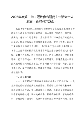2023年度第二批主题教育专题民主生活会个人发言(新对照六方面)根据《学习贯彻XXX新时代中国特色社会主义思想主题教育专题民主生活会工作方案》的要求,本人按照学思想、强党性、重实践、建新功的总要求,系统学习了XXXXXX关于严肃党内政治生活、树立和践行正确政绩观重要论述,学习了党章、新形势下党内政治生活的若干准则、《中国共产党纪律处分条例》和《县以上党和国家机关党员领导干部民主生活会若干规定》等内容,紧盯个人思想、学习和工作实际,把自己摆进去、把职责摆进去、把工作摆进去,在广泛征求意见建议、普遍开展谈心谈话深入梳理检视问题的基础上,认真对照六个方面内容,深刻查摆检视,深挖问题根源,明确整改措施。现将本人对照检查情况汇报如下:一、存在的问题(一)学习贯彻XXX新时代中国特色社会主义思想方面。一是对加强党的创新理论武装的重要性、紧迫性认识不够完整准确。在政治和全局方面,自己的站位还不够高,未能从当前我国发展面临新的战略机遇、新的战略任务、新的战略阶段、新的战略要求、新的战略环境之中,充分认清错综复杂的矛盾和问题,全面深入开展理论学习的自觉性和主动性不足,用新时代党的创新理论观察新形势、研究新情况、解决新问题的历史自觉与历史主动有所欠缺。二是把党的创新理论转化为思想武器和实践力量不够有效。将党的创新理论的学习过程,仅仅作为增强理论知识和理论素养的过程,未能将其作为训练思维方式、提升思维层次、增长工作本领的过程,灵活运用XXX新时代中国特色社会主义思想、发挥主观能动性的思维能力还有所欠缺。(二)维护党中央权威和集中统一领导方面。一是站在政治高度上看问题的意识还不够强烈。在谋划工作和处理问题上,国之大者的政治意识不足,有时未能完全从党的立场思考问题,没有将自己的责任意识提升到捍卫党的理想信念、维护党的团结统一、密切党群关系、巩固党的执政基础的政治高度,也没有把所分管的领域、所从事的全部工作,都放到党和国家工作大局中来谋划,在统筹处理以大局推动局部、以重点牵引全局、以局部支持大局方面不够科学和均衡。二是锤炼自身政治担当持续用力不足。在工作中,政治使命感还不够正、不够强,一些工作只想干的快,干出彩,未能从增强人民群众的获得感、幸福感的角度,进行政治定位,特别是对干部群众急难愁盼问题关注度不够高,对急难险重的工作存在畏难情绪,缺乏大无畏的政治品格没有真正扛起与岗位相匹配的政治责任。(三)践行宗旨、服务人民方面。一是政绩观树立和践行得不够牢固。在思想深处上,还没有完全解决好树什么样的政绩、政绩为谁而树、怎样树政绩的问题,有时统筹谋划工作,安排部署任务,还是存在干快活、好落实、造亮点、出政绩的思维偏差一些工作并没有达到打基础、利长远、惠民生、得民心的目的和要求。二是满足群众各方面诉求和多层次需要不够有效。在推进中国式现代化建设的进程中,自己未能完全适应和掌握当前的新形势、新任务、新要求,对于时代潮流下群众的思想观念、行为方式、价值取向,缺少准确的认知、把握和判断,做群众工作的能力和方法已经不能满足新时代的要求,导致自己未能全面把握干部群众的新期盼、新需求、新诉求。(四)求真务实、狠抓落实方面。一是推进工作落实不够科学有效。自己服务大局的支撑度不足,遇事先统筹的意识和能力不足,在推动工作落实的过程中,不善于将分管工作置于大局之中去把握和谋划,未能科学摆布好各方面关系,处理好优先顺序,发挥好各自优势,在凝聚合力推动工作落实方面,统筹性协调性和时效性有所不足。二是自我革命的内生动能力不足。面对复杂多变的国际形势和艰巨繁重的国内改革发展任务,面对错综复杂、千头万绪的工作,有时只想按部就班,不想领异标新,存在一定的思维惯性和路径依赖,不愿意以新视角研判形势、新思路推进工作、新举措破解难题,自主性改革探索的精神有所欠缺。(五)以身作则、廉洁自律方面。一是廉洁自律意识的保养仍需持续加强。对XXXXXX关于党的建设的重要思想以及全面从严治党的重要论述多想多悟,学深学透做得还不到位,未能全面全面准确领会其中的丰富内涵、思想文化和实践要求,也未能深刻感悟蕴含其中的政治品格、价值追求和精神风范,导致自己自律的态度、平静的心态、简朴的作风,并没有随着年龄、党龄的增加而逐步强化,擦除思想上的灰尘不够及时,修补思想上的缺损不够有效,距离时刻保持思想意识处于完好健康状态的高标准要求,还有一定差距。二是自我约束上不细不严。在日常工作生活中,能够严格按照廉政准则和廉洁从政的各项规定要求自己,但在一些细节问题上标准不高、要求不严,还存在上面抓的紧就执行的严,抓的松就执行的宽,执行制度规定的标准不高,只求过的去,不求过的硬。比如,在招商引资、会见外地客商时,为了表达诚意、留住客商、谈成项目,还存在上白酒的现象。(六)履行全面从严治党政治责任方面。一是开展廉政教育持续用