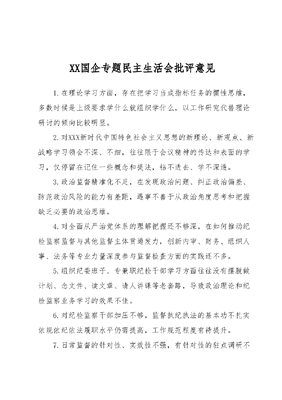 XX国企专题民主生活会批评意见1.在理论学习方面,存在把学习当成指标任务的惯性思维,多数时候是上级要求学什么就组织学什么,以工作研究代替理论研讨的倾向比较明显。2.对XXX新时代中国特色社会主义思想的新理论、新观点、新战略学习领会不深、不细,往往限于会议精神的传达和表面的学习,仅停留在记住一些概念和提法,钻不进去、学不深透。3.政治监督精准化不足,在发现政治问题、纠正政治偏差、防范政治风险的能力有差距,遇事不善于从政治角度思考和把握缺乏必要的政治思维。4.对全面从严治党体系的理解把握还不够深,在如何推动纪检监察监督与其他监督主体贯通发力,创新内审、财务、组织人事、法务等专业力量深度参与监督检查方面的实践还不多。5.组织纪委班子、专兼职纪检干部学习方面往往没有摆脱做计划、念文件、读文章、请人讲课等老套路,导致政治理论和纪检监察业务学习的效果不佳。6.对纪检监察干部加压不够,监督执纪执法的基本功不扎实依规依纪依法履职水平仍需提高,工作规范程度有待提升。7.日常监督的针对性、实效性不强,有针对性的驻点调研不够,比较依赖谈心谈话、调研督导、专项检查等传统监督方式,缺乏行之有效的创新载体。8.在监督检查中,虽然能够看到廉洁风险点,但对具体怎样预防、怎样监管考虑的不深入,有针对性提出风险防控措施的办法还不多。9.围绕重大节日和关键节点的主动监督不够,往往以发廉洁过节提醒,代替实地监督,开展四不两直监督检查和明察暗访的频次较少。10.廉政党课的针对性和感染力不强,没有充分结合不同类型的教育对象的特点。未组织党员干部对党章党规党纪开展系统学习,在纪律建设、纪律教育方面用力不足。11.对企业发展的难点、堵点在哪,掌握得还不够精准。参与三重一大事项决策也主要是从监督的角度去发表意见,很少站在集团发展的大局去思考、提要求。12.在工作统筹方面做得不够好,对省纪委、集团党委安排的任务抓得紧、落实快,对集团纪委自主部署开展的工作抓得松、推动慢。
